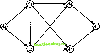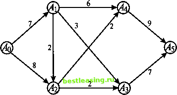 Сложим л - 1 равенство из условия 3. Имеем Прежде чем переходить к преобразованию обеих частей полученного равенства, сделаем два полезных замечания. Замечание 1. Каждая дуга сети является выходящей и входящей одновременно. Например, дуга AiAk для узла At является выходящей, а для узла Ак входящей. Замечание 2. И в левой, и в правой части этого равенства потоки суммируются по всем дугам заданной сети. Просто они по-разному сгруппированы. Учитывая отмеченные обстоятельства, перегруппируем слагаемые в обеих частях последнего равенства следующим образом: 2*4.4) + 2*4.4)+.-.+ 2*4-i>4) = = 2*4.4)+-+ 2*4.4-1)+ 2*4.4.) (суммирование в каждом из л слагаемых левой части ведется по всем дугам, выходящим из узлов Д), Ли4-1 соответственно, а суммирование в каждом из л слагаемых правой части ведется по всем дугам, входящим соответственно в узлы Аь Ап). Переписав условие 3 чуть иначе, 2*4.4)= 2*4.4). к= I, л - 1 (мы поменяли местами левую и правую части и изменили индексы суммирования), нетрудно заметить, что 2-я, 3-я, л - 1-я и л-я суммы в левой части рассматриваемого и весьма большого по размерам равенства соответственно равны 1-й, 2-й, л - 2-й и л - 1-й суммам в его правой части. Это означает, что это равенство легко упрощается до равенства 2*4.4)= 2*4.4) /€М0}- ми* (от левой части осталась только 1 -я сумма, а от правой части только л-я). Отсюда уже совсем просто вытекает, что ![]() Рис. 16 1) ориентация всех дуг пути совпадает с направлением перемещения от узла Aq к узлу А (такой путь будем называть ориентированным путем), 2) среди дуг пути есть такие, ориентация которых противоположна направлению, по которому мы перемещаемся из узла Д> в узел Ап; такие дуги в отличие от прямых дуг, ориентация которых совпадает с выбранным направлением перемещения, будем называть обратными. Путь AoAiAaAs на рис. 16 является ориентированным (ориентация всех дуг пути совпадает с направлением перемещения по этому пути от узла Ао к узлу А5), а путь АоА2А\АуАь - нет (дуга А\А2 для этого пути является обратной). В то же время с направлением перемещения по пути AoAiAiAaAs ориентация дуги АХА2 совпадает (этот путь является ориентированным). Дугу AjAk сети будем называть насыщенной, если поток по этой дуге равен ее пропускной способности, tp(AnAk) = c&. <р(АпАп) = <p(A0,Ai)=v. Далее будем считать, что в сети нет кратных дуг (дуг, соединяющих одну и ту же упорядоченную пару узлов) и при наличии дуги AtAk дуга АкА{ в сети отсутствует. Рассмотрим произвольный путь в транспортной сети, ведущей из источника Aq в сток Ап (рис. 16). Возможны два случая: Поток в сети будем называть полным, если любой ориентированный путь из источника в сток содержит по меньшей мере одну насыщенную ДУГУ- Покажем, как найти в транспортной сети полный поток. 0-й шаг. Построим произвольный потоку в сети (можно и нулевой). 1-й шаг. Если поток не полный, то в сети существует ориентированный путь, ведущий из источника Д> в сток Ап, ни одна из дуг которого не является насыщенной. Это позволяет увеличить поток по всем дугам этого пути на одно и то же число так, чтобы хотя бы одна из его дуг оказалась насыщенной. Это число легко найти - оно равно wm(cA-<p(AnAk)\ где минимум берется по всем дугам рассматриваемого пути. Если получаемый при этом поток еще не полон, возникает необходимость 2-го и даже последующих шагов. Однако, в силу ограниченности пропускной способности дуг в сети, число этих шагов конечно, и рано или поздно необходимость 