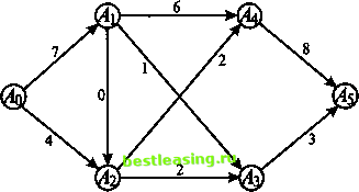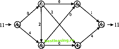 Увеличим теперь найденный полный поток (величины 10) на 1 для всех прямых дуг этого пути (это дуги ДДг, А\А и АуА5) и уменьшим его на 1 для его единственной обратной дуги АгА\ (рис. 23а). ![]() Рис. 23а В результате получаем поток, величина - 11 - которого совпадает с пропускной способностью минимального разреза (рис. 236). ![]() Рис. 236 Заметим, что пропускная способность любого разреза сети, изображенной на рис. 236, одна и та же и равна 11. 3.5. критический путь Предположим, что требуется проанализировать сложный проект с точки зрения минимальных временных затрат на его выполнение. Для этого проект разбивают на отдельные работы (этапы, операции), оценивают время, необходимое на проведение каждой работы, и записывают последовательность, показывающую, какие работы должны быть закончены прежде, чем начнутся другие работы. Приведем типичный пример. Таблица 1