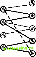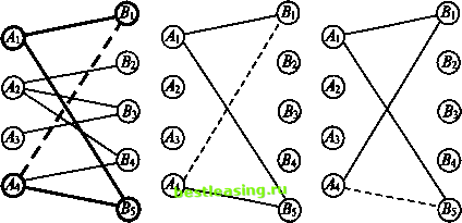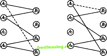 отличающимся значениями величин х23, х24, х33 и х34 (подчеркнутые равны нулю). Чтобы лучше понять основную идею, стоит рассмотреть следующий улучшающий шаг. Добавив к набору звеньев А\Вг9 А2ВЪ А2ВА, А4В4, АВЬ (рис. 14) звено А{В5, получаем цикл (1, 5) -> (4, 5) -> (4, 4) -> (2, 4) -> (2, 2) -> (1, 2) -> (1, 5), самый дешевый маршрут в котором А{В$ не используется (соответствующая клетка свободна), а все остальные задействованы (соответствующие клетки базисные). В таблице 5 стоимости соответствующих перевозок подчеркнуты. Беря, как и раньше, стоимости перевозки единицы груза в нечетных клетках со знаком +, а в четных со знаком -, получим 4 -14+ 9- 5 + 7- 6 = 20-25 = -5 и в соответствии с этим переместим наименьший из грузов в четных клетках в клетку (1, 5) по маршруту АХВ5. Сравнивая грузы 23,18 и 15, получаем, что перемещаемый груз должен быть равен 15 (таблица 6). ![]() Рис. 14 Таблица б На рисунках 15 иД 6 показано, как именно изменяются маршруты. Общая сумма перевозки станет равной 1255 -75= 1180. ![]() ® ® Рис. 15 Рис. 16 Таким образом, отыскивая в таблице (и/или на соответствующем рисунке) свободные клетки (незадействованные маршруты), ищем цикл с отрицательной ценой и перебрасываем по нему наибольшее возможное количество единиц груза, уменьшая тем самым общую стоимость перевозок. Поступая так, мы рано или поздно придем к оптимальной схеме перевозок. На рисунках 17-37 и в таблицах 6-13 показаны шаги, завершающие решение рассматриваемой задачи. Обратимся к таблице 6. Перебрасывая по циклу (в таблице 6 стоимости соответствующих перевозок подчеркнуты) наибольшее возможное количество единиц груза (8), уменьшаем общую стоимость перевозок на 9 8 = 72, (4, 1) -> (1, 1) -> (1, 5) -> (4, 5) -> (4, 1) с отрицательной ценой 13 - 12 + 4 - 14 = -9 1180-72 = 1108 ![]() Рис. 17 Рис. 18 Рис. 19 Таблица 7