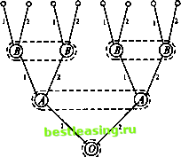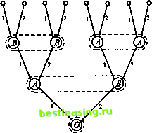 3 0 3 0 В итоге искомая матрица игры имеет вид 0,5 -1 3,5 2\ -1 3 -3,5 0,5/ Пример 9. 1-й ход делает игрок О, выбирая число х, равное 1, с вероятностью 2/3 и, равное 2, с вероятностью 1/3. Если х = 1, то на 2-м ходе игрок А выбирает число у из множества двух чисел {1,2}, зная результат случайного выбора на 1-м ходе, а на 3-м ходе игрок В выбирает число z из множества двух чисел {1,2}, зная х, но не зная у. Если х = 2, то на 2-м ходе игрок В выбирает число у из множества двух чисел {1, 2}, зная результат случайного выбора на 1-м ходе, а на 3-м ходе игрок А выбирает число z из множества двух чисел {1,2}, зная х, но не зная у. После этого игроки расплачиваются, используя функцию (#). Графическое представление этой игры показано на рисунке 33. Чистую стратегию игрока А в данной игре можно описать упорядоченной парой \y,z\, где у (у = 1, 2) - выбор игрока А на 2-м ходе, если на 1-м ходе выбрано х = 1, a z (z = 1, 2) - выбор игрока А на 3-м ходе, если на 1-м ходе выбрано х = 2. Например, стратегия 1, 2 означает, что на 2-м ходе игрок А выбирает у = 1, а на 3-м ходе - z = 2. Тем самым, у игрока А четыре стратегии: А\ - 1, 1, А2 - 1, 2, А3 - 2, 1, Л - 12, 2. У игрока 5 те же четыре стратегии: Д- 1,1, Д- 1,2, 2?3- 2,1, Д- 2,2. Покажем теперь, как найти элементы матрицы выигрышей игрока А Пусть, например, игрок А применяет стратегию 42 - 1, 2, а игрок В - стратегию В3 - 2,1. Различаются два случая: 1) х= 1, 2) х=2. По условию при х = 1 игрок Л имеет возможность сделать только 2-й ход (выбрать у), а игрок В - только 3-й (выбрать г). При х = 2 их возможно-