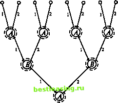 предложений, способных, по ее мнению, заинтересовать сторону Л. В свою очередь, сторона А, ознакомившись с реакцией стороны В на сделанные предложения, высказывает ей новое предложение, внеся одну из нескольких возможных корректировок в свое первоначальное предложение с учетом мнения стороны В, и т. д. Если предмет переговоров сложен, то подобный обмен ходов может затянуться. Однако любые переговоры непременно заканчиваются. И там, на финише, ждет функция выигрышей. Попробуем смоделировать короткий переговорный процесс трехходовой позиционной игрой. Предположим, что переговоры заканчиваются через три хода, на каждом из которых соответствующая сторона имеет возможность выбора из двух альтернатив, и опишем соответствующую позиционную игру. 1-й ход делает сторона А: она выбирает одно из двух возможных предложений - число х из множества двух чисел {1, 2}. 2-й ход делает сторона R она выбирает число у из множества двух чисел {1,2}, зная число х, предложенное стороной А. 3-й ход делает сторона А: она выбирает число z из множества двух чисел {1,2}, зная о предложении стороны В на 2-м ходе и помня собственное предложение на 1-м ходе. После этого сторона А либо получает вознаграждение (например, в виде кредита от стороны В), либо выплачивает стороне В штраф. Все эти возможности описываются функцией выигрышей W(x, у, z), заданной следующей таблицей: W(l,l,l) = я, W(2,l,l) = е, Ж(1,1,2) = Ь, (2,1,2) = /, W(l,2,l) = с, (2,2,1) = g, W(l,2,2) = d, W(2,2,2) = Л. Графическое представление этой игры показано на рисунке 36. Ясно, что описанная позиционная игра является игрой с полной информацией. Начнем с описания возможных стратегий игрока В. Поскольку игроку В выбор игрока Л на 1-м ходе известен, то у игрока В четыре стратегии: В, - [1, 1], Д - [1, 2], В3 - [2, 1], ВА - [2, 2]. ![]() Рис. 36 Чистая стратегия игрока А в данной игре описывается упорядоченной тройкой (*, Izu z2)). Здесь х (х = 1, 2) - альтернатива, которую игрок А выбирает на 1-м ходе, Z\ (zi = 1,2) - альтернатива, которую игроке выбирает на 3-м ходе, если на 2-м ходе игрок В выбрал первую альтернативу {у = 1) и z-i (zi = 1,2) - альтернатива, которую игроке выбирает на 3-м ходе, если на 2-м ходе игрок В выбрал вторую альтернативу (у = 2). Например, выбор игроком А стратегии (1, [2,1]) означает, что на 1-м ходе игрок А выбирает х = 1, а на 3-м z = 2, если игрок В выбрал у = 1, и z = 1, если игрок В выбрал у = 2. Тем самым, у игрока А восемь чистых стратегий: А{ - (1, [1, 1]), А2 - (1, [1, 2]), А3 - (1, [2, 1]), А4 - (1, [2, 2]), А5 - (2, [1, 1]), А6 - (2, [1, 2]), А7 - (2, [2, 1]), А% - (2, [2, 2]). Покажем теперь, как определяются элементы таблицы выигрышей игрока А. Пусть, например, игрок А выбрал стратегию Аь - (2, [1, 2]), а игрок В - стратегию В3 -- [2,1]. Тогда х = 2. Из [2, 1] вытекает, что у = 1, а из (2, [1, 2]), что * = 1. Отсюда W(x,y,z) = 0Т2,1.1)-* Рассчитывая по этой же схеме все остальные элементы таблицы выигрышей, в итоге получим