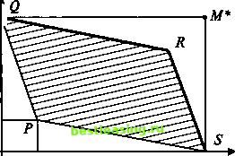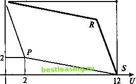 о (Фтах> тах) ![]() ![]() Ф2 Ф4Ф6 Ф5 Фз *1 Рис. 9 1-й шаг, 1-я уступка. Лицо, принимающее решения, соглашается немного ослабить свои изначальные требования по 1-му критерию и заменить Фтах на Фь Аналитик-специалист при помощи границы Парето множества Я (дуги АВ) показывает ему, что соответствующее значение 2-го критерия не может быть больше Ч. Скорее всего лицо, принимающее решения, не сочтет полученную пару (Фь Ч) приемлемой, но согласится немного ослабить свои требования на значение 2-го критерия, что приведет к необходимости 2-го шага. 2-й шаг, 2-я уступка. Лицо, принимающее решения, соглашается заменить Wmax на Аналитик-специалист при помощи границы Парето множества Я (дуги АВ) показывает ему, что соответствующее значение 1-го критерия не может быть больше Ф2. Скорее всего лицо, принимающее решения, не сочтет полученную пару (Ф2, *Рг) приемлемой, но согласится еще немного (по сравнению с Фх) ослабить свои требования по 1-му критерию, что приведет к необходимости 3-го шага. Ясно, что с каждым шагом, с каждой уступкой просматриваемая часть границы Парето будет сокращаться (см. рис. 9) и, когда пара (Фя, Ч?п)9 полученная на п-м шаге, покажется лицу, принимающему решения, приемлемой, процесс поиска подойдет к концу. Останется лишь найти решение системы ABDAlBDAlB2 ЭА3В2 ЭА3В4 ЭА5ВА D... Ф(х,) = ФЛ, Щх,у) = Ча. Полученная в результате пара чисел х = х* и у = у* и будет ответом к исходной задаче, полученным методом уступок. 6.3. Метод идеальной точки Другой подход, также использующий множество Парето, называется методом идеальной точки. Он состоит в отыскании на границе Парето точки, ближайшей к точке утопии, задаваемой лицом, принимающим решения. Как уже отмечалось выше, обычно лицо, принимающее решения, формулирует цель в виде желаемых значений показателей, и часто в качестве координат целевой точки выбирается сочетание наилучших значений обоих критериев (как правило, эта точка при заданных ограничениях не достигается; поэтому ее и называют точкой утопии). Рассмотрим конкретный пример поиска идеальной точки. Пример. Пусть на множестве со плоскости (х, у), определяемом системой неравенств 0<х<2, 0<д><2, заданы две линейные функции tf=5x->>+2, ( К = -х + Зд> + 2. Требуется найти решение задачи U max V max при условии, что (х, у) Е О). Множество со представляет собой квадрат (рис. 10), вершины которого имеют координаты 0,0), 5(0,2), 0(2,2), Д2,0). В силу линейности критериев U и V квадрат ABCD переходит в параллелограмм PQRS (рис. 11), координаты вершин которого Л2,2), 0,8), Д(10,6), 5(12,0) вычисляются по формулам (-&). ![]() ![]() 12 U Рис. 11 Точка утопии М*(12, 8) считается заданной (ее координаты суть наибольшие значения U и V). Граница Парето параллелограмма PQRS состоит из двух отрезков - QR и RS (рис. 12). Точка, ближайшая к точке утопии М*, принадлежит множеству Парето и должна лежать на одном из составляющих его отрезков - или на отрезке QR, или на отрезке RS. Рис. 12 Чтобы найти на отрезке QR точку, ближайшую к точке М*, воспользуемся прямой, проходящей через точки Q и А Подставляя в общее уравнение прямой aU+pV=y координаты точек Q и R,