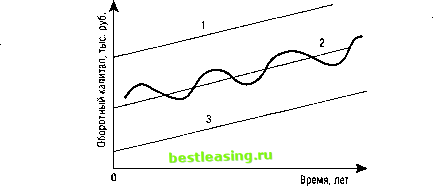 С06 и СОт - средние остатки производственных запасов и готовой продукции в базовом и текущем периодах (тыс. руб.); Р6 и Рт - полная себестоимость реализованной товарной продукции (объема продаж) в базовом и текущем периодах (тыс. руб.); Д6 и Дт - длительность базового и текущего периодов в днях. Сумма вовлечения (+) и привлечения (-) финансовых ресурсов в хозяйственный оборот (ДФР) составит: АФР = Исо х Оот, (103) где Исо - изменение скорости оборачиваемости оборотных активов в днях ( + - ускорение, - - замедление); 00Т - однодневный оборот в текущем периоде, исчисленный по полной себестоимости реализованной товарной продукции (тыс. руб.). Эффективность комплексного управления текущими активами и пассивами может быть повышена за счет использования спонтанного финансирования, факторинга, учета векселей и других мероприятий, что позволит финансовому менеджеру оптимизировать расчеты и размер оборотных активов, ускорить оборачиваемость оборотных средств предприятия. Управление финансированием текущих финансовых потребностей предприятия зависит от стратегии покрытия потребности в оборотных средствах (оборотном капитале). Характер перспективного изменения текущей потребности в оборотном капитале для развивающихся предприятий представлен на рис. 11. ![]() Рис. 11. Изменение текущей потребности в оборотном капитале для развивающихся предприятий Волнообразная кривая 2 представляет колебания потребности предприятия в оборотном капитале при ее нарастании. Когда потребность не покрывается долгосрочным финансированием, предприятие привлекает короткие деньги (прямая 3), выступая заемщиком. Если потребность в оборотном капитале покрывается мобилизованными долгосрочными источниками с избытком, то в краткосрочном плане предприятие становится кредитором (прямая 1). Прямая 2 отражает оптимальное состояние ресурсов, а кривая 2 - ситуацию, когда предприятие в текущей деятельности выступает то как заемщик (ниже прямой 2), то как кредитор (выше прямой 2). Объем долгосрочного финансирования при нарастающей потребности предприятия в оборотном капитале определяет, кем оно выступает в текущем плане - заемщиком или кредитором. Потребность в краткосрочном финансировании может быть представлена как отрицательная разница между объемом располагаемого долгосрочного финансирования и нарастающей потребностью предприятия в оборотном капитале. Финансовому менеджеру рекомендуется соблюдать фундаментальный принцип соответствия сроков функционирования активов и источников их финансирования. Постоянная минимальная потребность в оборотных средствах финансируется за счет собственного капитала, а сезонная и другая дополнительная потребность - за счет краткосрочных заемных (кредитных) источников. Анализ рис. 11 показывает, что увеличение оборотных средств и оборотного капитала стратегически возможно проводить также за счет долгосрочных источников в результате превышения общего объема долгосрочного финансирования над нарастающей потребностью в оборотном капитале (прямая 1). Экономической основой такого положения выступает принципиально иной, чем в отечественной экономике, состав опорных долгосрочных источников финансирования. К источникам финансирования в зарубежных странах относится не только долгосрочный кредит, но в первую очередь выпуск и перви