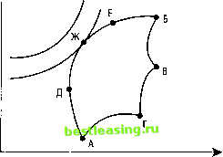 ковой ставки либо общие прогнозы риска и доходности рыночного портфеля. Поэтому задача менеджера по управлению портфелем заключается в наблюдении за значениями безрисковой ставки и состоянием индексного фонда, а также постоянном контакте с инвестором. Практика показывает, что только 4% западных менеджеров ис/ пользуют пассивную тактику. I Активные менеджеры имеют собственные прогнозы риск и ожидаемой доходности, которые отличаются от общего мнения р>ш-ка. Они считают, что время от времени появляются неверно оцененные рынком ценные бумаги. При этом одни менеджеры могут быть настроены как быки по сравнению с общим мнением рынка относительно той или иной бумаги, другие - как медведи . Первые будут держать в портфеле ценные бумаги в пропорции, большей чем нормальная, а вторые - в меньшей чем нормальная. Основой активного управления портфелем является выбор ценных бумаг, приемлемых для формирования портфеля. Выбор ценных бумаг может осуществляться несколькими способами. Перед активным менеджером стоит задача прогнозирования ожидаемой доходности, стандартного отклонения и ковариации всех доступных ценных бумаг. На основе этих прогнозов определяется эффективное множество, для которого будут построены кривые безразличия. Понятие эффективного множества связано со множеством всех оценок допустимых портфелей (речь идет о множестве оценок, а не портфелей), которое геометрически изображается множеством точек на критериальной плоскости. Поскольку инвестор при выборе ценных бумаг исходит лишь из оценок их доходности и риска, то множество показывает пределы эффективности его выбора. Если объединить в портфель несколько ценных бумаг, корреляция доходности которых лежит в диапазоне от -1 до +1, то в зависимости от их удельных весов можно построить множество портфелей с различными параметрами риска и доходности, которые расположатся в рамках фигуры АБВГ на рис. 16. Рациональный инвестор будет стремиться минимизировать свой риск и увеличить доходность, поэтому всем возможным портфелям, представленным на рис. 16, он предпочтет только те, которые расположены на отрезке ДЕ и составляют эффективную границу множества. Это объясняется тем, что портфели на кривой ДЕ являются доминирующими по отношению к портфелям с тем же уровнем риска или с той же доходностью. Доминирующий портфель - это порт- фель, который имеет самый высокий уровень доходности для данного уровня риска или наименьшее значение риска для данного значения доходности. Доминирующий портфель является лучшим выбором для инвестора из числа всех возможных портфелей. Ожидаемая доходность ![]() Стандартное отклонение доходности Рис. 16. Кривые безразличия при активном управлении портфелем Набор портфелей на отрезке ДЕ называют эффективным набором, состоящим из доминирующих портфелей. Эффективный набор портфелей на кривой ДЕ составляет эффективную границу, определить которую можно с помощью компьютерных программ, рассчитав соответствующие удельные веса входящих в портфель ценных бумаг, при которых минимизируется значение стандартного отклонения для каждого данного уровня доходности. Менеджеру следует делать инвестиции в те ценные бумаги, которые формируют оптимальный портфель инвестора, соответствующий точке, в которой кривая безразличия является касательной к эффек