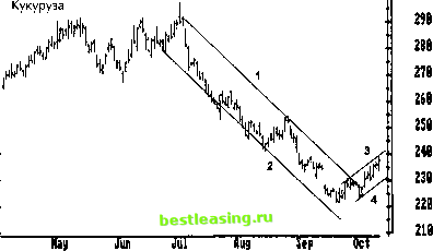 После прорыва очень крутой восходящей линии тренда цены нередко снова растут, достигая прежнего максимума и подбираясь к своей уже прорванной линии тренда снизу (рис. 20-2 и 21-3). Это создает почти идеальную ситуацию для игры на понижение: ведь одновременно имеются двойная вершина, возврат к старой линии и, не исключено, расхождение технических индикаторов, дающих сигнал играть на понижение. При нисходящих тенденциях действуйте так же, но в обратном направлении. Тактика игры 1. Играйте в направлении наклона линии тренда. Если она идет вверх, ищите возможность купить и избегайте игры на понижение. Если она идет вниз, ищите возможность сыграть на понижение и избегайте игры на повышение. 2. Линия тренда - это либо поддержка, либо сопротивление. При росте цен отдавайте приказы о покупке вблизи линии тренда, а защитный стоп-приказ ставьте ниже нее. При нисходящих тенденциях действуйте так же, но в обратном направлении. 3. Крутые линии тренда обычно заканчиваются резкими прорывами. Если крутизна линии превышает 45 градусов, располагайте стоп-приказ прямо на линии тренда и ежедневно его подтягивайте. 4. Прорвав крутую линию, цены нередко возвращаются к недавнему максимуму на усохшем объеме и расхождениях с техническими индикаторами. Это - превосходная возможность для игры на понижение. Понижение до прежнего минимума после прорыва нисходящей линии тренда создает условия для покупки с относительно небольшим риском. 5. Проведите линию канала (channel line) параллельно линии тренда и используйте ее как мишень (target) для снятия прибыли. Каналы тендениий Канал состоит из двух параллельных линий, ограничивающих поток цен (рис. 21-4). Если провести линию тренда через впадины, а затем параллельную ей прямую через пики, то получится линия канала. Если же провести нисходящую линию тренда через пики, то и параллельная ей прямая, проведенная через впадины, будет линией канала. ![]() Рис. 21-4. Линии канала и предварительные линии тренда Нисходящая линия тренда 1, проведенная через пики подъемов, указывает на медвежий рынок. Линия канала 2 проведена параллельно линии тренда, но через впадины. Линия канала выявляет максимальную силу медведей при нисходящей тенденции. Наилучшие условия для короткой продажи - в верхней половине нисходящего канала, а для покупки - в нижней половине восходящего канала. Когда иены, прорвав нисходящую линию тренда, идут вверх, с помощью линии канала можно построить предварительную линию тренда. Для этого проведите новую линию канала 3 через два последних пика подъемов. Затем проведите параллельную ей линию 4, захватив недавнюю впадину. Это и будет новая предварительная восходящая линия тренда. У правого края графика иена на кукурузу растет. Она очень дорогая: приближается к потолку канала. Если хотите играть на повышение, приказ о покупке лучше отдать ближе к новой восходящей линии тренда 4. Линии канала, как и линии тренда, следует проводить через края зон застоя, минуя самые высокие максимумы и самые низкие минимумы. Значимость линий канала зависит от количества ее соприкасаний со столбиками цен. Наличие линии канала увеличивает значимость линии тренда. При восходящей тенденции линия канала отражает область максимальной силы быков, а при нисходящей тенденции - максимальной силы медведей. Чем шире канал, тем сильнее тенденция. Надо торго