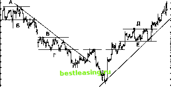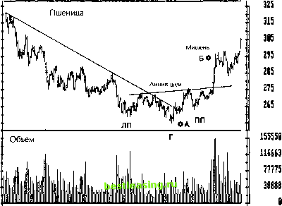 ![]() Dug Sep Oct Nov Dec Jan leb Nar Apr Рис. 23-2. Перевернутые голова и плечи Пока тенденция идет вниз, большой объем сопутствует всем спадам -вплоть до левого плеча (ЛП). Спад в зону головы (Г) происходит на малом объеме: сигнал тревоги медведям. Подъем из зоны головы, взметнувшись над нисходяшей линией тренда, оповешает об ее окончании. Малый объем в зоне правого плеча (ПП) и восходяшая линия шеи указывают на приближение мошного подъема. Скачок объема при прорыве линии шеи подтверждает, что началась новая тенденция. Ни одно из возвращений цен не дотянуло до этой линии. Мишень (Б) и голова модели (А) равноудалены от линии шеи (первая -над ней, вторая - под ней). Подъемы от перевернутых головы и плеч обычно перекрывают мишени. Самая лучшая возможность купить была у правого плеча с защитным стоп-приказом чуть ниже головы. У правого края графика виден разрыв - свидетельство сильной восходящей тенденции. При игре на повышение защитный стоп-приказ надо ставить чуть ниже нижнего края разрыва. Прямоугольники обычно шире при восходящих тенденциях и уже при нисходящих тенденциях. Чем длиннее прямоугольник, тем серьезнее прорыв из него. Особенно значимы прорывы из прямоугольников на недельных графиках, т.к. они знаменуют собой весомую победу либо быков, либо медведей. Есть несколько методов определения вероятной мишени прорыва. Можно, например, измерить высоту прямоугольника и спроецировать ее от прорванной границы в направлении прорыва: это минимальная мишень. Максимальную мишень определяют по вертикальной проекции длины прямоугольника от прорванной границы в направлении прорыва. Как указывает Тони Пламмер (Топу Plummer), прямоугольник - это часть спиралевидного развития тенденции. Рекомендуемый им метод определения мишени таков: измерить высоту прямоугольника, умножить ее на один из коэффициентов Фибоначчи (1,618; 2,618 и 4,236) и спроецировать полученную величину в направлении прорыва. Тактика игры Биржевые трейдеры могут сделать деньги, торгуя на кратковременных перепадах в рамках прямоугольника, но действительно большие деньги сулит игра в направлении прорыва. 1. Торгуя в рамках прямоугольника, покупайте у нижней границы, а продавайте - у верхней. Осцилляторы помогут определить момент надвигающегося разворота цен в рамках прямоугольника. Стохастический осциллятор, индекс относительной силы и процентный диапазон Уиль-ямса (см. главу 4) фиксируют развороты цен внутри прямоугольников, когда они достигают своих пограничных линий (reference lines) и меняют направление. При покупке у нижней границы прямоугольника размещайте защитный стоп-приказ чуть ниже него. При игре на понижение возле верхней рамки прямоугольника размещайте защитный стоп-приказ чуть выше этой границы. Нужно действовать проворно, снимая прибыль при первом же признаке разворота. Рискованно выжидать, пока цены передвинутся еще на несколько тиков в рамках прямоугольника. 2. Для определения вероятности прорыва либо вверх, либо вниз проанализируйте рынок в более крупном масштабе времени по сравнению с тем, в котором играете. Чтобы поймать прорыв на дневном графике, определите тенденцию недельного, поскольку прорыв, вероятнее всего, произойдет в том направлении (см. раздел 43). 3. При покупке после прорыва вверх или короткой продаже после прорыва вниз размещайте защитный стоп-приказ внутри прямоугольн