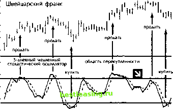 Рис. 30-1. Таблица расчетов стохастического осциллятора %К быстрого стохастического осциллятора аналогична %R. %D быстрого стохастического осциллятора получена сглаживанием %К по трехдневному окну. %D быстрого стохастического осциллятора становится %К медленного стохастического осциллятора и вторично сглаживается для получения %D медленного стохастического осциллятора. Для построения стохастического осциллятора большинство трейдеров пользуются компьютерами. Выбор окна стохастического осциллятора зависит от того, какую тенденцию вы хотите выявить. Узкое окно (около пяти дней) позволяет опознать краткосрочные развороты, а более широкое (2-3 недели) -более значимые перемены на рынке. Психология биржевой толпы Каждая цена - это соглашение о ценности рынка, достигнутое всеми трейдерами в момент сделки. Особенно важны цены закрытия, т.к. от них зависят денежные расчеты между трейдерами. Максимум в любом окне отражает максимальную силу быков в этот период, а минимум - максимальную силу медведей. Стохастический осциллятор измеряет способность быков или медведей закрыть цены у верхнего или нижнего края недавнего диапазона. При подъемах цен рынок обычно закрывается вблизи максимума. Если быки могут поднять цены в течение дня, но не в состоянии закрыть их у высшего уровня, то стохастический осциллятор поворачивает вниз. Он указывает, что быки слабее, чем кажутся, и дает сигнал к продаже. При нисходящих тенденциях цены обычно закрываются вблизи минимума. Если в конце дня цены оказываются вблизи максимума - значит, медведи могут понижать цены временно, в течение дня, но не в силах удерживать их на низком уровне. Поворот стохастического осциллятора вверх означает, что медведи слабее, чем кажутся: это - сигнал к покупке. Тактика игры Стохастический осциллятор показывает, когда быки или медведи становятся сильнее или слабее. Он помогает определить, у какой группы больше шансов выиграть текущую рыночную схватку. В пари об исходе поединка логичнее делать ставку на более сильного соперника. Стохастический осциллятор подает три типа игровых сигналов. По уровню силы на первом месте - расхождения пиков или впадин; затем - уровень стохастических линий; и, наконец, их направление (рис. 30-2). Расхожления Наиболее сильные сигналы к покупке или продаже стохастический осциллятор посылает при расхождениях с ценами. 1. Расхождение впадин происходит, когда цены падают на новую глубину, однако впадина стохастического осциллятора выше предыдущей. Это показывает, что медведи выдыхаются. Подъем стохастического осциллятора от второй впадины подает сигнал к покупке: играйте на повышение, разместив защитный стоп-приказ ниже последнего минимума. Самые сильные сигналы к покупке - когда первая впадина находится под нижней погранлинией, а вторая - над ней. 2. Расхождение пиков происходит, когда цены подскакивают на новую высоту, а пик стохастического осциллятора ниже, чем при предыдущем подъеме. Значит, быки выдыхаются. Разворот стохастического осциллятора вниз от второго пика - сигнал к продаже: играйте на понижение, разместив защитный стоп-приказ чуть выше последнего максимума цен. Самые сильные сигналы к продаже поступают, когда первый пик находится выше верхней погранлинии, а второй - ниже. ![]() 68.S3 (7.88 65.48 (3.96 62.43 128.88 98.88 68.88 38.88 область перепроданности 8.88 Рис. 30-