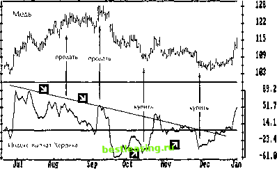 Рис. 35-1. Таблица расчетов индекса выплат Херрика Этот индекс измеряет объем торговли, открытый интерес и изменения цен. Он основан не на ценах закрытия, а на средних ценах - среднем соглашении о ценности рынка на данный день. HPI - сложный индикатор, и для его расчета без компьютера практически не обойтись. / - абсолютное значение разности между сегодняшним и вчерашним открытым интересом; G - меньшее из значений сегодняшнего и вчерашнего открытого интереса. Знак + или - в правых скобках определяется так: Если М > М , то ставится + ; если М < М , то ставится - . вч 8ЧТ HPI применим лишь к дневным данным, но не к недельным или внутридневным. Недельного открытого интереса в природе не существует. Дело в том, что недельный объем можно вычислить, сложив дневные объемы за пять дней, а суммировать открытый интерес за несколько дней нелогично. Рынки сообщают внутридневной объем поминутно, но не сообщают внутридневной открытый интерес. Психология биржевой толпы Индекс выплат Херрика рассчитывается по средним ценам, а не по ценам закрытия. Дневная средняя цена - это среднее соглашение о ценности рынка на данный день. Объем отражает степень финансовой и эмоциональной вовлеченности игроков данного рынка. Когда объем растет, HPI увеличивается. Ежедневные колебания открытого интереса отражают приток и отток капиталов с рынка. Возрастание открытого интереса указывает на вероятность продолжения тенденции. Уменьшение открытого интереса указывает на вероятность разворота тенденции. Неизменный открытый интерес нейтрален. Тактика игры Индекс выплат Херрика подает несколько видов сигналов, перечисленных ниже в порядке значимости. Расхождения между HPI и ценами указывают на самые удачные моменты для открытия позиций (рис. 35-2). Прорвав свою линию тренда, HPI предупреждает о возможном прорыве линии тренда цен. Пересекая свою нулевую линию, HPI подтверждает новые тенденции цен. 1. Если цены упали на новую глубину, а новая впадина HPI мельче предыдущей, то это - расхождение впадин, которое подает сигнал к покупке. Когда HPI поворачивает вверх от своей второй впадины, покупайте, разместив защитный стоп-приказ ниже последнего минимума. 2. Расхождение пиков образуется, когда цены достигают новой высоты, а новый пик HPI уступает предыдущему. Сигнал к короткой продаже -это разворот HPI вниз от второго пика. Размещайте защитный стоп-приказ выше последнего максимума. Ключевые расхождения складываются не сразу, а неделями. Расхождение, которое складывалось два месяца, весомее расхождения с полумесячным интервалом между пиками или впадинами. Следите за высотой или глубиной крайних точек HPI. Если первый пик (или первая впадина) далеко от нулевой линии, а второй - близко, то это расхождение предупреждает о важном развороте. Расхождения пиков и впадин HPI и цен зачастую намного опережают разворот тенденции цен. Если расхождение указывает на возможность разворота, ориентируйтесь на краткосрочные осцилляторы, чтобы точнее рассчитать момент разворота. Если расхождение не обернулось разворотом, внимательно следите за развитием ситуации: она может дать даже лучший шанс, если обычное расхождение превратится в тройное расхождение пиков или впадин. Тройное расхождение впадин состоит из трех более низких впадин цен и трех более высоких впадин HPI. Тройное расхождение пиков состоит из трех 