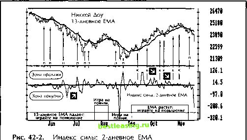 Рис. 42-1. Таблииа расчетов индекса силы Инлвкс силы = Объем сег (Ucer - UB4) Краткосрочный индекс силы сглажен с помощью 2-дневного ЕМА. Среднесрочный индекс силы сглажен с помощью 13-дневного ЕМА. На заметку компьютерным программистам: для уменьшения чересчур большого числа расчеты можно подправить, деля индекс силы каждого дня на иену закрытия этого дня. Гистограмма несглаженного индекса силы скачет вверх-вниз. Этот индикатор подает более четкие сигналы, если сгладить его с помощью скользящего среднего (см. раздел 25). Его 2-дневное ЕМА дает минимальную степень сглаживания и помогает определить подходящие моменты для открытия и закрытия позиций. Торгуя в направлении 13-дневного ЕМА цен, покупайте, когда 2-дневное ЕМА индекса силы ниже нуля, и продавайте, когда оно выше нуля. 13-дневное ЕМА индекса силы выявляет более крупные изменения в соотношении сил быков и медведей. Восходя над нулевой линией, оно провозглашает власть быков на рынке. Став минусовым, оно возвещает, что к власти пришли медведи. Расхождения между 13-дневным ЕМА индекса силы и ценами указывают на ключевые поворотные моменты рынков. Психология игры Если рынок закрывается выше, чем накануне, то победа за быками, а если ниже, то победа за медведями. Расстояние между сегодняшней и вчерашней ценами закрытия отражает размер выигрыша. Чем больше разница, тем весомее победа. Объем торговли отражает степень вовлеченности игроков (см. раздел 32). Движение цен при высоком объеме сродни горной лавине, нарастающей при скатывании. У подъемов и спадов на высоком объеме инерция выше, и они более способны к продолжению. Низкий объем, напротив, показывает, что приток кандидатов потерять деньги иссякает и тенденция выдыхается. Цены отражают мысли игроков, а объем - их эмоции. Индекс силы связывает цены и объем и показывает, в ладу ли у рынка ум с сердцем. Поднимаясь до новой высоты, индекс силы говорит: быки сильны и восходящая тенденция должна продолжаться. Упав на новую глубину, индекс силы говорит: сила медведей велика и нисходящая тенденция должна сохраниться. Если изменения цен не подкреплены аналогичным изменением объема, то индекс силы, оставаясь на одном уровне, предупреждает о близком развороте тенденции. То же происходит, когда высокому объему торговли сопутствует мизерное колебание цен. Тактика игры Краткосрочный инлекс силы 2-дневное ЕМА индекса силы - чувствительный индикатор краткосрочной силы быков и медведей. Взметнувшись над нулевой линией, оно говорит о превосходящей силе быков; упав ниже нее, оно говорит о превосходстве медведей. 2-дневное ЕМА индекса силы - благодаря его особой чувствительности -лучше применять только для уточнения сигналов прочих индикаторов. Допустим, индикатор тенденции выявил восходящую тенденцию. Тогда по спадам 2-дневного ЕМА индекса силы можно определить лучшие моменты для покупки. А если долгосрочный индикатор выявил нисходящую тенденцию, 2-дневное ЕМА индекса силы укажет лучшие моменты для открытия коротких позиций (рис. 42-2). 1. Покупайте, если во время восходящей тенденции величина 2-дневного ЕМА индекса силы станет минусовой. ![]() Этот чувствительный краткосрочный индикатор ловит благоприятные моменты для покупки (к) при восходяших тенденциях и для короткой продажи (п) при нисходяших тенденциях. Он помогает воспользоваться слабостью цен для 