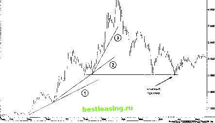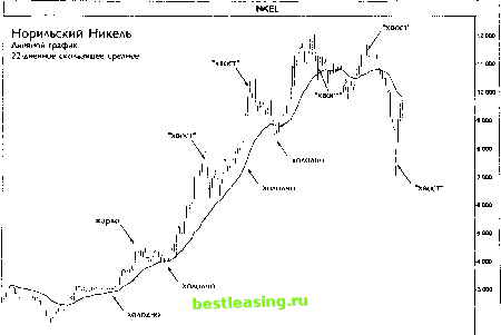 ![]() Рис. 1. Температура, хвосты, скользящее среднее Лучше открывать позиции, когда разрывы между высшей и низшей точками столбиков невелики. Короткие столбики показывают, что толпа трейдеров спокойна и риск проскальзывания невелик. Когда столбики становятся вдвое или втрое выше, чем в среднем за последний месяц, это показывает, что рынок кипит. Тогда пора снимать прибыль, а не открывать новые позиции. Хвост - это длинный столбик, окруженный двумя короткими. Хвосты зачастую отмечают серьезные развороты тенденций. Обратите также внимание, как хорошо 22-дневное экспоненциальное скользящее среднее отслеживает тенденцию акции. Лучше покупать, когда цены вблизи скользяшего среднего, а снимать прибыли, когда цены далеко отрываются от него. Скользящее среднее показывает общее соглашение о ценности данного рынка, а взлеты над ним выявляют уровни оптимизма, которые долго не продержатся. толпа закусила удила и несется вверх либо вниз. Осторожный трейдер предпочитает открывать позиции, когда столбики коротки. Тогда легче дать лимитированный приказ - приказ купить или продать по заданной цене. Когда столбики длинны, толпа возбуждена, цены скачут, и открывать позицию придется по рыночному приказу - приказу купить по любой цене. Проскальзыва- ние в таком случае будет гораздо выше. Понимание того, что графики отражают поведение толпы, позволяет нам принять более верные решения. Классический технический анализ - это прикладная психология масс. Различные модели на графиках отражают поведение биржевой толпы. Уровни поддержки показывают, где быки пересиливают медведей, а уровни сопротивления -где медведи заваливают быков. Угол наклона линии тренда показывает, с какой интенсивностью победители бьют побежденных. Если бьют обстоятельно и не торопясь, то побои могут продолжаться долго. Линия тренда под небольшим углом может тянуться и тянуться. Яростные побои долго длиться не могут, и поэтому когда линия тренда становится практически вертикальной, она показывает, что крутое движение цен подходит к концу. Когда цены начинают скакать почти вертикально, они могут за день покрыть дистанцию, которую до этого проходили за месяц. Открывать позицию в такие дни - как прыгать на спину убегающему коню. Шансы разбиться выше, чем прокатиться. Психологически зрелый трейдер не пинает себя за то, что упустил взлетающую свечой тенденцию. Он знает, что за год поймает достаточно тенденций, чтобы остаться с хорошей прибылью. Перефразируя старую поговорку, всех хватать, жене не останется . Основная проблема классического технического анализа - его субъективность. У трейдера, прикладывающего линейку к графику, часто дрожит рука. Когда он играет на повышение, дрожь подталкивает линейку повыше, а когда на понижение, то рука дрожит по иному, толкая линейку пониже. Субъективность - ахиллесова пята классического технического анализа. Хорошие сделки легко найти в центре графика. Уровни поддержки, сопротивления, наклон линии тренда, - все совершенно очевидно. К сожалению, невозможно найти брокера, который принимал бы приказы в центре графика. Все они принимают приказы только у правого края. Некоторые трейдеры, сильно битые на рынках, начинают бояться открывать сделки. Они расчерчивают свои графики цветными карандашами, красиво размечая классические модели - голова и пл
