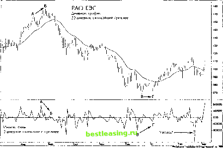 EESR ![]() Рис. 6. Индекс силы Индекс силы, как и все осцилляторы, раскачивается вокруг нулевой оси, как маятник. Он показывает, когда быки и медведи достигают максимальных уровней силы и краткосрочная тенденция готова развернуться. Самые лучшие сигналы осцилляторов - их расхождения с иенами. В точке Б EESR поднимается выше, чем в А, но слабый подъем индекса силы показывает, что быки выдохлись и тенденция готова к развороту. Когда скользящее среднее поворачивает вниз, оно подтверждает, что медведи будут заправлять этим рынком всерьез и надолго. Противоположный сигнал виден в районе В-Г. EESR бьет по линии поддержки, но индекс силы гораздо выше в точке Г, чем В. Он показывает, что медведи выдохлись. Когда скользящее среднее поворачивает вверх, оно подтверждает, что быки пришли к власти и играть надо на повышение. Заметьте очень глубокий спад индекса силы близ правого края графика. Минимум, который в два-три раза ниже предыдущих, указывает на панику в стаде быков, которые в большом объеме выбросили акции. Вычистив таким образом слабых быков, рынок готов к развороту вверх. Панические гвозди индекса силы, так же как и хвосты, зачастую выскакивают перед важными разворотами в пользу быков. свои системы. Большинство трейдеров слишком ленивы, чтобы запрограммировать его. Самое занятное, что большинство из тех, кто запрограммировал его для себя, - трейдеры, занимающиеся внутридневной торговлей. Их я всегда предупреждаю, чтобы были осторожны. Дело в том, что внутридневной объем большинства биржевых инструментов идет по кривой, напоминающей латинскую букву U. Объем, как правило, выше всего в первые полчаса после открытия рынка и в последние полчаса перед закрытием, ниже всего в середине дня. Бывают исключения, когда реакция на неожиданные новости в середине дня ведет к всплеску объема, но обычная кривая объема - в форме U. Использовать индикатор, построенный на объеме, в таких условиях затруднительно, хотя люди это делают. А вот на дневных графиках индекс силы работает отменно. Разработав новый индикатор, не почивайте на лаврах, а продолжайте прикидывать, как усовершенствовать его. Так, например, я стал применять новое правило по использованию биржевого рентгена (elder-ray). Сила быков равна высшей цене столбика минус скользящее среднее, а сила медведей - нижней точке столбика за вычетом того же среднего. Этот индикатор показывает, насколько высоко быки могут поднять цену над скользящим средним и насколько глубоко медведи могут ее утопить. Применяя этот индикатор к недельным графикам, где каждый столбик отражает одну неделю игры, я обратил внимание на то, как биржевой рентген помогает распознать серьезные развороты рынков. Представьте, что цены круто идут вверх, да так, что сила медведей, которая обычно выражается отрицательным столбиком, становится положительной -мишек подняли за шкирку. Отметьте амплитуду этой положительной силы медведей и представьте себе этот индикатор в виде натянутой резинки. Тенденция идет вверх, быки сильны, но у них есть предел - вы видите, как далеко вверх растягивается резинка медвежьей силы. Вдруг происходит огромный всплеск и резинка вытягивается выше, чем когда-либо раньше. Теперь остается только ждать, пока она не начнет укорачиваться. Это показывает, что быки после колоссального напряжения выдохлись и медведи оттягивают 
