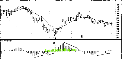 SSPSOOIndex SPX ![]() и ч is 42 ъ s he Igs % 1г П !a s >ib b bp т 14 gi ч ii 18 frs s *9 *ib 1гз 2001 abnjaiy Mate*. Aprt Цяу Jw> J>iy Рис. 6.6. Импульсная система Когда и ЕМА, и гистограмма MACD движутся в одном направлении, они указывают, что движение иен ускоряется. Удобнее всего отслеживать эту систему, запрограммировав сигналы к покупке и продаже разными цветами. Играйте в направлении импульса, чтобы поймать самые сильные движения рынка. Никогда не играйте против импульсной системы. Например, в марте и апреле бычье расхождение, двойное основание и хвост кенгуру указывали на формирование основания. Однако покупать при этом было нельзя, так как импульсная система указывала вниз. Сигнал к продаже исчез в точке А, что позволило открывать длинные позиции. Импульсная система четко отследила падение рынка в январе-марте и подъем - в апреле-мае. В мае сигнал импульсной системы к покупке исчез после возникновения медвежьего расхождения В, которое указало на возможность сыграть на понижение. Нисходящий тренд оказался не таким сильным, как два предыдущих тренда, с чередующимися сигналами к покупке и продаже. Когда возникают сомнения, как играть, лучше отойти в сторону. У правого края графика тройное бычье расхождение гистограммы MACD дает сигнал к покупке. Импульсная система только что перестала подавать сигнал к продаже. Рынок готов к взлету. Если вы купите, установив защитный стоп-приказ ниже последнего минимума, сделайте этот приказ разворотным - сыграйте на понижение, если стоп-приказ будет активирован. Если бычье расхождение окажется ложным, рынок даст сигнал собаки Баскервилей и должен будет резко упасть. ет на соотношение сил быков и медведей. Если гистограмма MACD повышается, значит, быки становятся сильнее, а если понижается - силу набирают медведи. Импульсная система выявляет столбики, где и инерция, и скорость направлены в одну сторону. Если ЕМА и гистограмма MACD растут, значит, быки сильны и восходящий тренд усиливается. А если ЕМА и гистограмма MACD одновременно понижаются, значит, на рынке побеждают медведи. Оба индикатора могут двигаться в одном направлении лишь короткое время, но в такие периоды рынок бежит бегом. Прежде чем применять импульсную систему, вспомните, как тройной экран анализирует рынки в нескольких масштабах времени. Выберите свой любимый масштаб и назовите его среднесрочным. Умножьте его на пять, чтобы найти долгосрочный масштаб. Если вы любите работать с дневными графиками, проанализируйте сначала недельный график и примите стратегическое решение: играть на повышение или понижение. Для анализа недельных графиков применяйте 26-недельное ЕМА, гистограмму MACD или оба этих инструмента. Определив долгосрочный тренд, вернитесь к дневному графику и ищите возможности играть только в направлении тренда на недельном графике. Импульсная система использует 13-дневное ЕМА и гистограмму MACD с периодами 12, 26 и 9. При этом ЕМА рассчитывается с меньшим периодом, чем обычные 22 столбика, что делает систему более чувствительной. Если на недельном графике тренд идет вверх, вернитесь к дневному и ждите момента, когда 13-дневное ЕМА и гистограмма MACD начнут повышаться. Если и рыночная инерция, и темп изменения цен растут, они подают сильный сигнал к покупке - надо открыть длинную позицию и держать ее, пока сигнал не исчезнет. Если на недельном графике тренд идет вниз, вернитесь к дневно