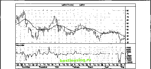 Вход Недельный: У правого края хвост кенгуру С - редкая модель на недельных графиках. Предыдущие хвосты А и В вели к мощным взлетам. Рынок в целом повышается. Дневной: Цены на уровне поддержки; хвост кенгуру В на дневном графике. Глубокий минимум двухдневного индекса силы у правого края отражает массированную ликвидацию позиций, которая, по-видимому, завершилась, так как цены поднялись выше уровня поддержки. Следует ожидать возврата цен к ЕМА. Действия: Открыл длинную позицию 2 мая 2001 г. по 33,86, стоп-приказ 30,50 - посередине хвоста. ![]() Рис. 10.16 Выход Дневной: Еще один хвост, на этот раз вверх. Ожидаемый подъем цен к уровню ЕМА произошел, но цены отскочили так быстро, что я не успел зафиксировать прибыль на том уровне. Действия: Закрыл длинную позицию 8 мая 2001 г. по 36,39. Оценка - 16% (2,53 пункта из канала шириной в 16 пунктов). Сделка 5 - Короткая позиция по ОСА Приятель-дантист попросил меня взглянуть на фирму, пытавшуюся приобрести контрольный пакет его зубоврачебной компании. Ему были предложены акции, но он не знал, стоило ли их брать. Мне показалось, что нет.