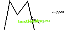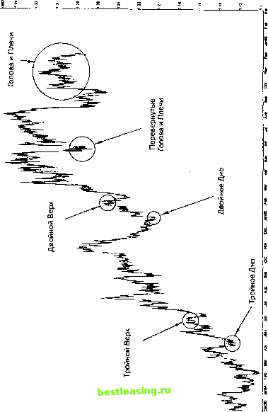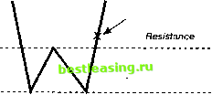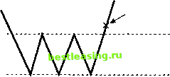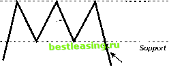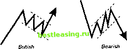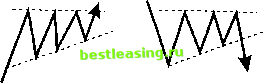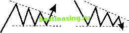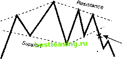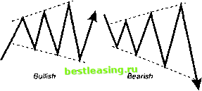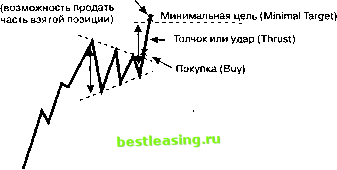 a) Triple Top Resistance ![]() Продажа (Sell) 6) Triple Bottom Рис. 4.15. Тройной верх a) и тройное дно б) Покупка (Buy) Resistance ![]() Support a) Double Top 6) Double Bottom Рис. 4.16. Двойной верх а) и двойное дно б) Resistance ![]() Продажа (Sell) Покупка (Buy) ![]() Support Diamond ![]() Продажа (Sell) Рис. 4.17. Фигура Бриллиант как сигнал разворота бычьего тренда 1) Кастрюли (Pots) ГЛ \J 2) Тарелки (Plates) У-\ У 3) Соусники или Круглые вершины и днища (Saucers or Round Tops and Bottoms) ![]() Рис. 4.18. Другие типы разворотных фигур ![]() Рис. 4.19. Примеры разворотных фигур на ежедневном графике движения курса Доллар/Экю График предоставлен агентством Reuter а) Сужающийся (Contracting Triangle) Bullish Bearish б) Восходящий (Ascending Triangle) ![]() Bullish Bearish в) Нисходящий (Descending Triangle) ![]() Bullish Bearish г) Расширяющийся (Expanding Triangle) ![]() Рис. 4.20. Виды треугольников Наиболее часто можно встретить сужающийся треугольник (contracting triangle). Его границы сходятся в одну точку и сим-: метрично наклонены к горизонту. Сужающийся треугольник может корректировать и бычий, и медвежий тренд. Немногим более редко встречаются восходящий (ascending) и нисходящий (descending) треугольники. Одна из их границ параллельна оси абсцисс, а другая наклонена, приближаясь к первой с раз-, витием треугольника. Восходящий треугольник более характерен как коррекция медвежьего рынка. Это можно объяснить тем, что . его верхняя граница параллельна горизонту и представляет собой ярко выраженный уровень сопротивления. В то же время его ниж-! няя граница более размыта, уровень поддержки четко определить довольно сложно. Такие черты присущи медвежьему рынку, кото-; рый в этом случае и является доминирующим. Нисходящий треу-; гольник чаще встречается при бычьем рынке. I Наиболее редкий тип треугольника - расширяющийся (ex-1 panding). Его границы со временем симметрично расходятся. j После завершения каждого из треугольников следует ожидать : возобновления движения в направлении предшествующего трен- j да. Момент, когда треугольник закончился, можно определить по \ следующим критериям: i 1. Внутри каждого треугольника можно заметить нечетное (но j не меньше пяти) количество колебаний (волн). ! 2. Сужающийся, восходящий и нисходящий треугольники обычно заканчиваются близко к точке пересечения своих границ, но никогда не позже. 3. После завершения треугольника цена должна резко повыситься или понизиться, т.е. пробить соответствующую границу. Явление, когда после завершения треугольника цена начина- j ет резко изменяться, называют толчком или ударом (thrust). Минимальная цель для толчка равна длине наибольшей волны треугольника. Поэтому после окончания треугольника имеет смысл встать в позицию на покупку или продажу в соответствии с ожидаемым направлением главного тренда: уже первое движение обещает достаточно большую амплитуду (рис. 4.21). Наиболее сильный удар наблюдается в случае, если послед-1 няя волна треугольника не дотягивает до границы, а заканчи- j вается раньше. I Треугольники - классический пример бокового тренда, по- скольку их колебания по сравнению с движениями бычьего или; медвежьего характера незначительны. 1 Некоторые аналитики различают такие фигуры продолжения,; как флаг (flag), вымпел (pennant), клин (wedge). Их отличия от j треугольников состоят во взаимном расположении верхней и \ нижней границ (рис. 4.22). Флаг и вымпел напоминают нисходящий; и восходящий треугольники, а клин - сужающийся. Возможно, эти три фигуры не всегда работоспособны, потому что, ка