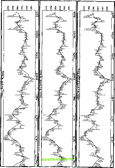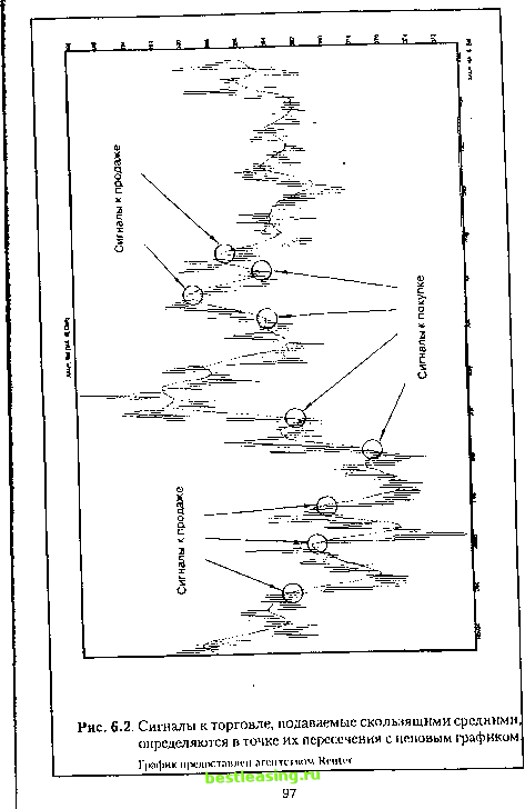 Глава 6 СКОЛЬЗЯЩИЕ СРЕДНИЕ 6.1. Общая характеристика методов фильтрации Методы фильтрации - одна из групп методов технического анализа, основанных на применении различных математических формул к движениям рынка. Термин фильтры говорит о том, что эти методы пытаются отделить трендовые ценовые движения от нетрендовых, экстремумы рынка от его равномерного развития. Проще говоря, методы этой группы различными способами подают сигналы о развороте бычьего или медвежьего тренда, а также подтверждают тот или другой сценарий развития цены - рост, спад или отсутствие серьезных движений. Мы подробно остановимся на применении скользящих средних и осцилляторов. И у той, и у другой методики есть свои преимущества и недостатки. В целом же их правильное использование может привести к значительным прибылям. Хотя данные методики и не так субъективны, как изложенные ранее фигуры, все же их применение требует некоторого уровня мастерства. Изучение основных понятий и физического смысла каждой методики не займет много времени, но может быть в высшей степени не бесполезно. Даже механические сигналы можно интерпретировать в зависимости от уровня их понимания. И все же, увлекаясь такого рода методами, не забывайте о том, что их используют многие участники рынка. Правила игры основаны лишь на заключениях статистического характера ( это сбывается довольно часто ) и не всегда имеют под собой идеологическую основу . Выбор, разумеется, за Вами. Кстати, помните про ЭКГ? Ничего более похожего на нее, чем осциллятор, Вам не найти. 6.2. Скользящие средние (Moving Averages) и их особенности Технический анализ с использованием фигур и линий трендов сложен в том отношении, что практически не поддается компьютеризации. Что касается скользящих средних, то их сигналы точны и недвусмысленны. Другое дело - насколько им стоит доверять. Проблема выбора собственного порядка скользящей средней, подходящего под анализ нужного периода каждого ценового тренда, оказалась настолько важной, что метод стал отдельной ветвью технического анализа. Главное преимущество при использовании скользящих средних: выбираем определенную линию, и после этого думать уже не надо, ведь сигналы подаются автоматически. Приходится затрачивать усилия только при выборе этой так называемой определенной линии . Характеристикой любой скользящей средней является выбираемый отрезок времени, называемый порядком. Объект вычисления средней - произвольный, обычно это значения цены. В зависимости от типа ценового графика - поминутного, почасового, ежедневного и т.п. - берут среднюю из цен закрытий минут, часов, дней. Некоторые считают, что цена закрытия не всегда объективна, и берут среднюю от усредненных значений цен за минуту, час, день. Возможны и другие варианты. Иногда скользящие строят для объема торговли или других технических индикаторов. В любом случае график скользящей средней отстает от графика движения рынка, поскольку включает в себя данные предыдущего периода времени. Для иллюстрации принципов построения скользящих средних возьмем ежедневную гистограмму (Daily Bar Chart) и порядок, равный восьми дням. 6.3. Типы скользящих средних Существуют три типа скользящих средних. 1. Простые скользящие средние (рис. 6.1 а). Способ построения простых скользящих средних, как следует из их названия, весьма прост. В наш
