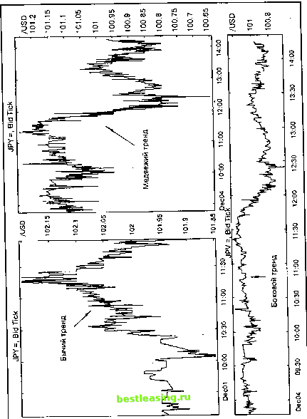 а) Бычий (Bullish) ![]() -- реальное движение цены - общее направление движения цены б) Медвежий (Bearish) ![]() в) Боковой (Sideways) ![]() Рис. 1.1. Три типа трендов а) Бычий - подъем цены б) Медвежий - спад цены в) Боковой - цена практически не движется ![]() Рис. 1.2. Три типа трендов на примере реального графика движения курса Доллар США/ Японская Йена График предоставлен агентством Reuter чертах оно повторяется на протяжении всей рыночной истории и соответственно отражается в графиках движений рынка. Аналитики предполагают, что если определенные типы анализа работали в прошлом, то будут работать и в будущем, поскольку эта работа основана на устойчивой человеческой психологии. Другими словами, с точки зрения технического анализа, понимание будущего лежит в изучении прошлого. Народная мудрость говорит о том же: новое - хорошо забытое старое. Технический анализ о старом не забывает. 1.3. Теория случайных событий и Геометрия Частей К чему ведут все постулаты, рассмотренные нами только что? К выводу, что движения рынка носят закономерный характер; поэтому теми или иными способами возможно успешно прогнозировать цену. Конечно, не могли не появиться оппоненты. В научной среде в 60-е годы возникла так называемая теория случайных событий (Random Walk Theory). До сих пор ее отголоски не дают покоя техническим аналитикам (но не практикам!) во всем мире. Эта теория говорит о том, что изменения цены хаотичны и ни на чем не основаны; ценовая история не может помочь в прогнозировании дальнейших трендов (которые, кстати, по этой теории вообще не существуют). Движения цен случайны и непредсказуемы; в целом же они колеблются случайным образом вокруг своей объективной цены. Поскольку с годами цены на все товары и услуги растут, то наилучшая торговая стратегия - купить товар и держать его до победного конца, пока не будет возможности выгодно продать. С момента возникновения этой теории было многое сказано и написано и одной, и другой стороной. Масса драгоценного времени потрачена на дебаты, не приведшие ни к какому соглашению: каждая сторона осталась при своем мнении. Но мы уже отметили то, что практики не включаются в подобного рода теоретические споры, потому что для них главный критерий - работоспособность той или иной теории. Не имеет смысла обсуждать стратегию купить и держать как ценную с точки зрения регулярной работы на рынке и выгодного помещения капитала. Ведь даже для вложения денег в недвижимость нужно как минимум знать, когда и как это делать (ну а при работе с фьючерсами и опционами тем более важен каждый день); не Понятно, как в этом случае воспринимать медвежий рынок - как фикцию или как реальность. Тренды видны на любом ценовом графике невооруженным глазом, но как объяснить этот факт, если цены изменяются случайным образом? Поэтому самым серьезным возражением сторонников технического анализа можно считать следующее, чисто эмпирическое и оправданное жизнью: утверждения теории случайных событий нереалистичны. Случайность движения цен для теоретиков - не что иное, как неудача в поисках и нахождении системы. Но ведь если они не могут обнаружить систему, это не значит, что ее вообще не существует. Кто из читателей может разобраться в электрокардиограмме, выглядящей, кстати, не так запутанно, как ценовой график? Только люди, так или иначе соприкоснувшиеся с медициной. Значит, оп