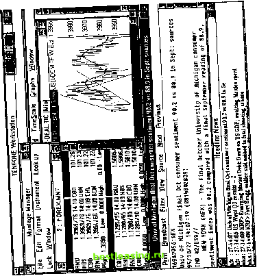 граммы. Временной интервал обновления данных определяется пользователем: от тиковых до минутных, часовых или месячных. Система позволяет выводить данные за 999 последних временных периодов (минут, часов). Предусмотрена возможность проведения технического анализа графиков путем нанесения линий трендов. Для детального исследования тенденций изменения.котировок используются инструменты компьютерного анализа: Moving Average, Rate of Change, Momentum, RSI, Stochastics. Углубленный технический анализ возможен при помощи специальной программы Danalyzer. News Manager Подсистема News обеспечивает поступление новостей в режиме реального времени от следующих агентств мира: Knignt-Ridder Financial; Vereinigte Wirtschaftsdienste; Market Comments; Agence France Presse. Сообщения поступают круглосуточно и освещают все основные сферы жизни современного мира, в том числе: политические события, экономические новости, аналитические обзоры, прогнозы ведущих экспертов, рекомендации дилерам, прогнозы погоды и т.д. Блок новостей по российскому финансовому рынку на русском языке представлен ведущими российскими информационными агентствами. Новости выводятся на экран в виде заголовков, и при необходимости можно просмотреть или распечатать весь текст сообщения. Имеется возможность фильтрации или выборки новостей по ключевым словам. Danalyzer Для углубленного технического анализа поступающих данных используется программа Danalyzer, которая органично дополняет систему Тешоге. Данные в программе Danalyzer могут быть представлены в виде линейных, гистограммных графиков, а также японских свечей и крестиков-ноликов. Временные интервалы определяются пользователем в следующих пределах: тик, минута, час, день, неделя, месяц. Система позволяет накапливать до 10 ООО значений по каждому временному интервалу. Возможна установка фильтров, которые произведут запись данных в определенные интервалы времени, например, во время торговых сессий. Для анализа тенденций изменения рынка на графики можно наносить линии трендов. При этом предумотрен большой выбор сервисных линий, в том числе параллельных, горизонтальных; по максимумам или минимумам, по закрытию; по уровням Фибоначчи, по углам Ганна. В системе имеется окола40 инструментов компьютерного анализа, в том числе: Commodity Channel Index (CCI); Moving Averages; Moving Averages Convergence-Divergence (MACD); %R; Rate of Change; Relative Strength Index; Stochastics; On Balance Volume. Данные из системы Tenfore могут быть переданы в режиме динамического обмена данными (DDE) в любой другой пакет, работающий в среде Windows. Например, перенос данных в электронную таблицу Excel позволяет отслеживать открытые валютные позиции, осуществлять глубокий финансовый анализ, формировать индивидуальный инвестиционный портфель и т.д. ![]() Рис.10.1. Внешний вид одного из макетов Tenfore список ИСПОЛЬЗОВАННОЙ И РЕКОМЕНДУЕМОЙ ЛИТЕРАТУРЫ