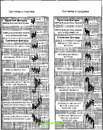 Рис. 3.7. График движения курса Доллар США/ Немецкая марка, записанный в технике Крестики-Нолики. График предоставлен агентством Reuter Особому методу технического анализа на основании графика крестиков-ноликов можно уделить очень много внимания. К сожалению, сейчас им пользуется все меньше и меньше трейдеров, и мы пойдем на поводу у моды, не вникая в особые подробности и ограничившись лишь несколькими замечаниями. Поворотные уровни для тренда можно определить следующими способами (рис. 3.8 а,б,в): 1. Считая количество крестиков/ноликов по вертикали, статистически определить, на каком уровне должен наступить разворот. 2. Проведя такое же исследование, но считая количество крестиков/ноликов по горизонтали. 3. Наблюдая за появлением особых фигур. 4. Прочертив из точек предыдущих экстремумов лучи под 45°, получить линии сопротивления или поддержки. Провести технический анализ на основании графика крестиков-ноликов наилучшим образом Вам поможет специальная литература с детальными рекомендациями по всем пунктам. Так, схематические иллюстрации этого раздела были взяты из книги Дж. Мерфи Технический анализ фьючерсных рынков (см. список литературы). 3.5. Японские свечи (Japanese Candlesticks Charting) Прогнозирование с помощью графика японских свечей - один из самых популярных методов технического анализа конца 80-х - 90-х годов. Этот метод - один из самых наглядных и естественных. Все названия свечей и формаций обусловлены жизненными явлениями (с японской точки зрения). Слово Candlestick переводится как подсвечник , но для удобства и американцы, и европейцы говорят просто о свечах (Candles). Российские трейдеры тоже почти всегда говорят о свечах . По этой причине вся терминология данного раздела будет смешанной англо-русско-японской, т.е. стандартно употребляемой российскими дилерами и аналитиками. Наиболее часто свечи етроят на ежедневных графиках (рис. 3.9). Это связано с тем, что в оригинале метод был создан и использовался именно для торгового дня. Вся психологическая подоплека прогнозирования на свечах основана на учете соотношения цен при открытии и закрытии одного и того же дня, а также соотношения цен закрытия предыдущего дня и открытия следующего. По словам некоторых трейдеров, свечи работают наилучшим образом на рынках с явно выраженной сессионной торговлей, например товарных. Применительно к валютным рынкам (FOREX) понятие закрытия-открытия несколько размыто, ведь торговля не прекращается круглые сутки. Способы прогнозирования на графиках Крестиков-Ноликов слева - вертикальный отсчет, справа - горизонтальный. Материал из кн.: D. Murphy Technical Analysis of the Futures Markets . ![]() Рис. 3.8 б. Способы прогнозирования с помощью графиков Крестиков-Ноликов: основные сигналы о покупке и продаже, получаемые с помощью фигур. Стрелка обозначает соответствующий сигнал. Источник: К.С. Zicgl& P.J. Kaufman Point and Figure Commodity Trading Techniques no материалам кн.: D. Murphy Technical Analysis of the Futures Markets 1 2 3 4 5 [ 6 ] 7 8 9 10 11 12 13 14 15 16 17 18 19 20 21 22 23 24 25 26 27 28 |