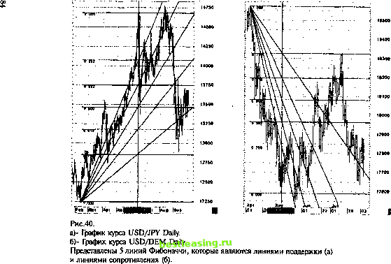 ная вечерняя звезда в додже (Evening Doji Star (EDS)), в которой в отличие от ES вторая свеча - додж, что усиливает поворотный сигнал с бычьего тренда на медвежий. Противоположностью EDS является фигура Трех - свечная утренняя звезда в додже (Morning Doji Star (MDS)), которая также является частным случаем модели MS, только в этом случае вторая свеча в комбинации - додж. Достоинство трех - свечных фигур по сравнению с двух - свечными и одно - свечными, которые мы рассмотрели выше, заключается в большей надежности подаваемых сигналов, а основной недостаток - в сравнительно большей жесткости четырех критериев формирования моделей MS или ES, что обуславливает сравнительно редкое формирование этих фигур на рынке Форекс. Тем не менее, вероятность правильного вхождения в рынок Форекс на основе только сигналов MS или ES близка к 80%. Таким образом, изученные модели на базе различных комбинаций японских свечей являются хорошим подспорьем в более полном анализе рынка. 1.7.2 Линии, периоды и дуги Фибоначчи На рис.40а, б представлены пять линий Фибоначчи, построенные на графике USD/JPY daily и USD/DEM daily. Из рисунка понятен способ построения указанных линий: на графике курса валюты выделяются два значительных экстремума - минимум и максимум; между этими точками откладывают пять длин коррекции (см. раздел 1.1.7): 0.250, 0.382, 0.5, 0.618 и 0.750, которые дают точки на правой вертикальной линии, проведенной через правый экстремум. Затем указанные точки коррекции соединяют с левым экстремумом. Как правило, построенные таким способом линии Фибоначчи являются хорошими уровнями сопротивления (для медвежьего тренда) и поддержки (для бычьего тренда). Как видно из рисунка, свое влияние эти линии оказывают и за пределами тренда, на базе которого они были построены. Действительно, на рис.40а линии были построены в момент, когда закончился бычий тренд. Нижняя линия Фибоначчи оказала достойное сопротивление сильному медвежьему тренду, как впоследствии и две другие линии. Две нижние линии Фибоначчи, построенные на медвежьем тренде (см. рис.406), впоследствии явились неплохими уровнями сопротивления. Верхняя линия оказалась хорошим уровнем поддержки после продолжительного ее пробития. Часто курс валюты впоследствии движется в пределах линий Фибоначчи (см. рис.406). Периоды Фибоначчи (см. рис.41) представляют собой последовательность вертикальных линий, которая эквивалентна числовой последовательности Фибоначчи (см. раздел 1.1.7). Здесь важно правильно ![]()