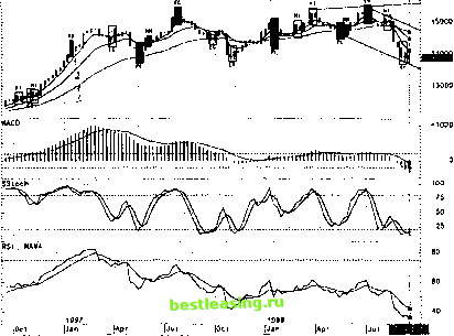 оба эти осциллятора также показывают бычье расхождение. Sstoch за пять баров до сегодняшнего бара начал показывать разворот, а четыре бара назад он пересек свою скользящую среднюю сверху вниз, тем самым усилив разворотный сигнал (подтверждением этому стало то, что сформировалась фигура типа неудавшийся размах - максимум не поднялся выше предыдущего, а предыдущий минимум оказался ниже предшествующего). Однако сегодняшнее значение стохастика ниже 25 и его большая удаленность от своей скользящей средней говорит о том, что скоро наступит консолидация или откат. Сигналы RSI уже около года находятся в зоне умеренной перекупленности, причем каждый последующий максимум располагается ниже предыдущего. Скользящая средняя RSI в зоне перекупленности располагалась последние месяцы горизонтально, тем самым не поддерживая больше бычий тренд. Наконец, в июле 1998г. RSI пересекает свою скользящую среднюю сверху вниз и быстро от нее удаляется, показывая растущую динамику ниспадающей тенденции. Анализ японских свечей (предпоследняя свеча показала слабую силу бычьего тренда, последняя свеча формируется черной) подтверждает нарастание медвежьего тренда. Таким образом, на основе месячного графика можно сделать вывод: тренд - вниз, сила - средняя, продлится тренд еще как минимум 1 - 2 месяца; ориентиры - 1.3000 и 1.2500 сильные уровни поддержки. На рис. 61 представлен недельный график USD/ CHF. Видно, что с апреля 1998 г. курс ходит в пределах расходящего треугольника, сейчас заканчивается формирование третьей линии у основания треугольника, причем курс вошел в треугольник снизу вверх. Это провоцирует нас сделать вывод о том, что курс отразится от основания и пойдет вверх. Помимо этого, с июля 1998 г. цена колеблется внутри ниспадающего канала (расположенного внутри упомянутого выше треугольника) и сейчас она находится у его основания. Анализ по ТД квалификаторам прорыва этой линии говорит о большой вероятности прорыва основания канала. Более быстрые скользящие средние тА(5) и тА(13) давно пересекли длиннопериодную тА(34) и направлены вниз. Линии скользящих средних ( как впрочем и линии канала) являются сильными уровнями сопротивления ( 1.4200, 1.4500) и поддержки (1.3500 и 1.3000). Сигналы конвергенции-дивергенции скользящих средних MACD подтверждают медвежью тенденцию: ее значения лежат в отрицательной области и динамика ее скользящей средней существенно отстает от гистрограмы MACD, говоря о продолжении доминирования медвежьих настроений на рынке. Sstoch находится в области сильной перепроданности, однако его минимум формируется ниже предыдущего минимума, что свидетельствует о слабости быков и должно несколько ![]() Рис.61. График курса USD/CHF Weekly (на момент времени 24.09.98п), на который наложены скользящие средние тА(5) (1), тА(13) (2), тА(34) (3). Под ними расположены индикаторы: MACD и его скользящая mA(7), Sstoch и его тА(5), RSI и его тА(7). успокаивать медведей. Кривая скользящая средняя RSI уверенно показывает вниз, а само значение индекса относительной силы находится под ней (подтверждение ниспадающей тенденции). Как видно на рис.61 минимумы на графике чередуются через 24-27 недель, т.е. следующая впадина, возможно, образуется через 5 - 7 недель. Анализ свечей противоречив: предпоследняя свеча показала слабость бычьих настроений, однако она и ее предшественница образовали бычью харами - сигнал вверх. Формирующаяся 