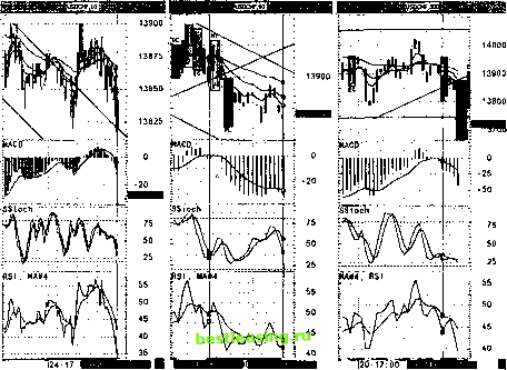 На первой развертке (300 мин) курс пытается пробить основание треугольника сверху вниз. Сигналы скользящих средних по - прежнему прогнозируют движение вниз как наиболее вероятное из возможных направлений. Конвергенция - дивергенция скользящих средних MACD также продолжает показывать хороший потенциал медведей. Sstoch все еще находится вблизи зоны перепроданности и продолжает предсказывать сильное движение вниз. RSI находится под своей скользящей средней и вместе с ней уверенно показывают тренд вниз. Японские свечи в данном случае не информативны. Таким образом, длиннопериодный интервал показывает движение вниз. На среднем периоде (60 мин) мы видим, что несколько часов продолжался сильный тренд вниз, причем цена пыталась пробить сильный уровень поддержки 1.3825, а сейчас наблюдаем начало консолидации; все скользящие средние направлены вниз, причем в самом низу птА(5), над ней располагается тА(13) и еще выше тА(34), что подтверждает ниспадающую тенденцию. MACD находится в отрицательной области, ее скользящая средняя направлена вниз, хотя крутизна наклона уменьшается, что говорит в пользу замедления существующего тренда. Sstoch и RSI показывают возможность движения как вниз, так и вверх. Продолжаем держать позицию открытой. На рисунке 70 представлено состояние рынка USD/CHF на 0:00 25.09.98.г. Как видно из первого экрана, наметилось сильное движение вниз после прорыва основания треугольника. Скользящие средние очень сильно ращепились и круто показывают вниз, причем наклон кривой тА(5) составляет более 60 градусов, наклон тА(13) - 45 градусов, а наклон кривой тА(34) равен 20 градусам. Это свидетельствует о движении вниз с хорошим темпом. Конвергенция - дивергенция скользящих средних показывает увеличение скорости падения цен: численные значения MACD и ее скользящей средней лежат в отрицательной области и продолжают расти по абсолютной величине, угол наклона вниз скользящей средней MACD продолжает увеличиваться, каждая последующая линия гистограммы MACD уверенно пронзает скользящую среднюю сверху вниз, что говорит о большом потенциале медведей. Стохастик расположен вблизи зоны перепроданности и продолжает подтверждать силу медведей. Скользящая средняя индекса относительной силы очень круто показывает вниз. Кривая RSI еще более стремительно удаляется вниз от своей кривой скользящей средней, усиливая тем самым доминанту медвежьих настроений участников рынка. ![]() Наметилось движение вниз и на втором экране. Действительно, цены ходят в пределах нового ниспадающего канала (см. рис.70). Скользящие средние смотрят вниз и демонстрируют хорошее расщепление , причем углы наклона этих кривых к оси времени увеличиваются с уменьшением периода скользящих средних. MACD показывает сильный медвежий потенциал: ее численные значения расположены в области -30, чуть выше расположена скользящая средняя конвергенции - дивергенции скользящих средних, причем ее наклон к оси времени опять начинает увеличиваться. Sstoch развернулся и показывает вниз, причем его кривая пересекла свою скользящую среднюю сверху вниз, демонстрируя сильное ра-щепление - хороший сигнал на продажу. RSI и его скользящая средняя уверенно движутся вниз, причем кривая индекса относительной силы проходит под своей скользящей средней, что показывает медвежью доминанту на рынке. Японские свечи также подтверждают нап