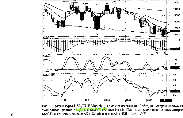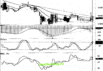 ![]() Японские свечи образовали двухсвечную комбинацию EG, что подтверждает вероятное корректирующее движение курса валют. Таким образом, месячный график USD/CHF на рис. 76 показывает ожидаемое движение курса вверх (между прочим, этот прогноз весомее, чем рассмотренный выше на рис. 75; хотя в нашем конкретном случае они и подтверждают друг друга). Конкретный момент вхождения в рынок можно искать по графикам USD/CHF weekly (рис.77) и daily (рис.78). Как видно из рис.77, мы наблюдаем длительный медвежий тренд, который к моменту исследования рынка основательно выдыхается. Действительно, цены движутся внутри сходящегося треугольника, вершина которого смотрит вниз. Курс валют вошел в треугольник снизу (на корректирующем движении основного тренда), дважды отразился от его основания и в настоящий момент пытается пробить линию тренда (которая является к тому же и верхней гранью треугольника). Исследования истинности - ложности пробоя говорят в пользу ложного пробоя. Т.е. следует ожидать еще одного движения вниз к основанию нашего треугольника, после чего провести еще одно тщательное изучение рынка. Следует заметить, что в любом случае выход цены из треугольника будет слабым (т.к. курс очень долго нахонаходится внутри треугольника и уже на расстоянии менее % от его вершины). Скользящая средняя тА(34) наклонена вниз под углом 20 градусов, что говорит о медвежьем тренде средней силы. Скользящая средняя тА(13) довольно длительное время (около 9 недель) расположена горизонтально и тем самым сближается с длинно-периодной тА(34), что показывает корректирующее движение цен вверх, а тА(5) за время формирования последних трех свечей даже перегнулась вверх и начинает пересекать тА(13) снизу вверх, усиливая тем самым временные бычьи настроения рынка. Конвергенция-дивергенция скользящих средних кривых находится в отрицательной области, но ее скользящая средняя кривая начинает посматривать вверх, а в долгосрочной перспективе мы видим сильный сигнал медвежьего схождения (схождение прямых АВ и CD). Линии гистограмм начинают не доходить до уровня своей скользящей средней. Т.е. сигналы MACD показывают нам, что медвежий тренд выдыхается и возможен откат курса вверх. Стохастик находится в зоне перепроданности, под ним проходит его скользящая средняя кривая, причем мы наблюдаем хорошее ра-щепление этих линий в течение последних девяти баров, что демонстрирует доминирование бычьих настроений рынка за последние 9 недель. Ясно одно, что на медвежьем тренде долго такая ситуация продолжаться не может и по - видимому вскоре следует ожидать откат стохастика вниз. Обращаю Ваше внимание на тот факт, что формирующийся максимум оказался выше предыдущего, что ослабляет последующие медвежьи настроения участников рынка. Скользящая средняя кривая индекса относительной силы только- 14000 ![]() s ep ]ocT lN°~TD c Van w]f b~ilaV Apr [jHay ) j un j uT [Aug (sei p 0сТ ЩИЩ Рис.77. График курса USD/CHF Weekly (на момент времени 04.12.95г.), на который наложены скользящие средние mA(5) (1), тА(13) (2), тА(34) (3). Под ними расположены индикаторы: MACD и его скользящая mA(7), Sstoch и его mA(5), RSI и его тА(7). 1 2 3 4 5 6 7 8 9 10 11 12 13 14 15 16 17 18 19 20 21 22 23 24 25 26 27 28 29 30 31 32 33 34 35 36 37 38 39 40 41 42 43 44 45 46 47 48 49 50 51 52 53 54 [ 55 ] 56 57 58 59 60 61 62 63 64 65 66 67 68 69 70 71 72 73 74 75 76 77 78 79 80 81 82 83 84 |