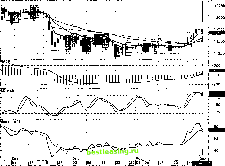 ![]() Рис.78. График курса USD/CHF Daily (на момент времени 04.12.95r.), на который наложены скользящие средние mA(5) (1), тА(13) (2), тА(34) (3). Под ними расположены индикаторы: MACD и его скользящая mA(7), Sstoch и его тА(5), RSI и его тА(7). только начинает показывать вверх, а сама кривая RSI располагается сверху над своей средней, что несколько обнадеживает быков. Но численные значения осциллятора RSI и его скользящей средней равны 48 и 45 соответственно, т.е. они попали в мертвую зону, выход из которой равновероятен как вверх, так и вниз. Циклический анализ прогнозирует слабое движение вниз в течение ближайших шести баров. Японские свечи сформировали фигуру HI белого цвета, что говорит о насыщении медвежьих настроений (все, кто хотел продать, уже продали, а вот число желающих купить начинает увеличиваться). Таким образом, если в ближайшее время и продолжится медвежий тренд, то он будет слабым и непродолжительным, как впрочем и не следует ожидать каких - то сильных движений на прогнозируемом повышательном тренде. Рис.78 усиливает выводы предыдущего рисунка 77. На самом деле, цены довольно долго двигались внутри слабо сходящегося узкого треугольника, вход в который был сверху, и вершина которого смотрит вниз. Выход из треугольника произошел вверх и оказался довольно сильным (котировки возросли на 250 пипсов). В настоящий момент цены уткнулись в сильный уровень сопротивления 1.1750, и, похоже, что с первого раза им этот уровень не преодолеть. Кривые скользяшие средние демонстрируют хорошее ращепле-ние , причем внизу располагается гпА(34), которая направлена вверх под углом 15 градусов. Над ней расположена тА(13), которая начинает принимать горизонтальное положение, еще выше - кривая тА(5), которая далеко вверх оторвалась от своих mA( 13) и тА(34) и начинает перегибаться вниз, чтобы сблизиться со своими длиннопериодными напарницами . Отсюда можно предположить, что тренд - вверх, но пока слабый, а в ближайшее время вероятен небольшой откат курса вниз. Конвергенция-дивергенция скользящих средних кривых расположена в положительной области, хотя ее численное значение не велико (равно 97). Кривая скользящая средняя MACD уверенно показывает вверх, а линии гистограмм пересекают свою скользящую среднюю снизу вверх, прогнозируя хороший потенциал быков. RSI расположена вблизи зоны перепроданности и совместно со своей скользящей средней пытаются расположиться горизонтально, а до этого демонстрировали хорошую динамику движения вверх (см. рис.78). Вероятно, следует ожидать небольшого корректирующего движения вниз. Последняя японская свеча нарисовалась черной, а предпоследняя была белой с небольшим телом и длинными равными тенями. Прогноз на следующую - черная или додж. Хочу также обратить Ваше внимание, что в случае таких долгосрочных контрактов необходимо привлекать также весь арсенал фундамен- тального исследования рынка USD/CHF (об этом чуть позже, см. главу 2). Данные сравнения макроэкономических показаний экономик США и Швейцарии на декабрь 1995г. говорили в пользу США, т.е. на ближайший год в целом ожидался рост курса USD/CHF. Итак, для установочного набора валют с декабря 95г. по декабрь 96г. мы сделали первый выбор: 1) купили 10 млн. долларов США против продажи швейцарского франка по форвардному курсу 1.1395 на поставку в декабре 1996г. (что составляет рыночный курс 1.1580 минус 1.6%), при этом расчет % ставки таков: USD - 5.6% 