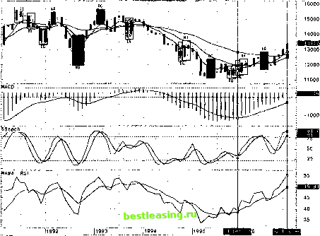 ![]() Рис.79. График курса USD/CHF Monthly (на момент времени 02.12.96п), на который наложены скользящие средние mA(5) (1), тА(13) (2), тА(34) (3). Под ними расположены индикаторы: MACD и его скользящая mA(7), Sstoch и его тА(5), RSI и его тА(7). ![]() Рис.80. График курса USD/CHF Weekly (на моментвремени 02.12.96г.), на который наложены скользящие средние mA(5) (1), тА(13) (2), тА(34) (3). Под ними расположены индикаторы: MACD и его скользящая mA(7), Sstoch и его тА(5), RSI и его тА(7). б) прибыль от курсовой разницы: 116 - 103.2 х 10 000.000 = JPY 128 000.000 = $ 1 103.448; 3) была открыта короткая позиция USD/ITL на сумму 10 млн.$; при этом: а) прибыль от разницы % ставок: 1582 - 1618 х 10 000.000 = ITL 360 000.000 = $ 236.531; б) прибыль от движения курса: 1522 - 1582 х 10 000.000 = ITL 600 000.000 = $ 392.218. Таким образом, чистая прибыль за 1 год равна $ 2 563.941 (примерно 256% от инвестиций). Приведенный пример наглядно показывает потенциальные возможности форвардного рынка Форекс с датой валютирования существенно большей 2 дней. Но не меньший интерес представляет возможность работать на однодневных форвардах (до слота). 1.9.2.2.2 Форвардные операции по схеме том - некст На коротких деньгах на форвардном рынке Форекс одним из самых распространенных сроков исполнения контракта является завтра (или том - некст (t/n)). Удобство такой схемы работы по сравнению со спот рынком заключается не только в сокращении в два раза даты валютирования, но и в возможности различных комбинаций форвардных сделок и операций на спот рынке. Если, например, первый контракт (вход в рынок: купил или продал) осуществляется с датой валютирования завтра , а выход из рынка (второй контракт: соответственно продал или купил) происходит на споте, то такая операция входа - выхода называется том - некст своп (tomorrow - next swap). Правила входа - выхода в том - некст рынок Форекса те же самые, что и для спот рынка (см. раздел 1.9.2.1): проводится полномасштабный технический анализ рынка и ищется оптимальный момент для входа (выхода) в него. При этом, конечно, можно работать только на форвардном рынке t/n без перехода на спот рынок. В таком случае практически нечего добавить к изложенному выше в разделе 1.9.2.1. Но более перспективными, я повторяю, в плане дополнительного заработка, так и частичной нейтрализации риска при проведении операций на споте, являются временные переходы с рынка спот на рынок том - некст и наоборот. Поясню это на примере. Допустим, комплексный анализ рынка спот USD/DEM показывает, что главный и промежуточный тренды являются бычьими. И Вы работаете в режиме коротких денег. Понятно, что в таком случае (с целью минимизации риска) Вы открываете только длинные позиции (по тренду). В этом случае необходимо осуществить переход с рынка спот на рынок том - некст. Это снизит риск потерь, а за счет сокращения даты валютирования даст дополнительную прибыль. Действительно, допустим на бычь- 1 2 3 4 5 6 7 8 9 10 11 12 13 14 15 16 17 18 19 20 21 22 23 24 25 26 27 28 29 30 31 32 33 34 35 36 37 38 39 40 41 42 43 44 45 46 47 48 49 50 51 52 53 54 55 56 [ 57 ] 58 59 60 61 62 63 64 65 66 67 68 69 70 71 72 73 74 75 76 77 78 79 80 81 82 83 84 |