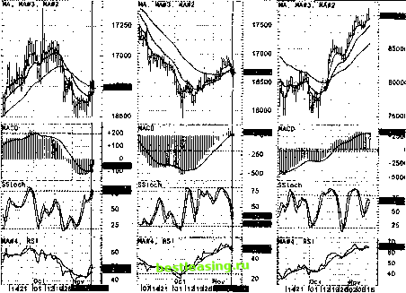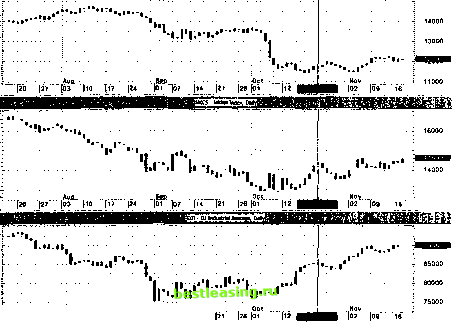 ШтвМЕЗ Ш8Ё ;i¥-2£i ULi; Гl 4L . ![]() [20 [27 03 Tib 17 ]Z4 01 [08 14 соответствующим этим валютам фондовым индексам. Причем, если базой котировки являются доллары США, то достаточно исследовать рынок индекса акций Доу Джонса. На рисунке 88 показаны графики курсов GBP/USD daily, USD/DEM daily и DJI daily и их основные индикаторы. Видно, что до первой декады октября наблюдаем монотонное падение курса USD/DEM (см. также рисунок 82 и раздел 1.9.2.5), причем, как было показано выше, оно более динамично, чем у GBP/USD. На рисунке конвергенция - дивергенция скользящих средних для USD/DEM находится в отрицательной области и показывает сигнал медвежьего расхождения, подтверждая движение курса вниз, при этом скользящая средняя MACD уверенно направлена вниз; сигналы стохастика и индекса относительной силы также подтверждают доминанту медведей на рынке. На правом экране рис.88 представлен график индекса Доу Джонса. Видно, что здесь также наблюдалось падение индекса до первой декады октября: кривая скользящей средней тА (34) уверенно показывает вниз и расположена сверху, под ней - кривая тА(13), а еще ниже проходит кривая тА(5).Тангенс угла наклона кривой гпА(34) к оси времени равен 0.6, что меньше, чем в случае кривой USD/DEM, то есть падение индекса осуществляется менее динамично, чем в случае USD/DEM. При этом следует отметить такой важный факт, как попытка DJI в конце сентября развернуться и пойти вверх, однако, как видно из рисунка, кривая тА(34) оказалась непреодолимым уровнем сопротивления, и впоследствии индекс продолжил свое падение. Однако, конвергенция - дивергенция скользящих средних, начиная с первых чисел октября, четко показала сигнал медвежьего схождения - предвестник разворота тенденции, причем скользящая средняя MACD уверенно показывает направление движения вверх. Численное значение Sstoch находится в зоне умеренной перепроданности, причем его кривая пересекла свою скользящую среднюю кривую и направлена вверх, что также подтверждает вероятный поворот тренда. Индекс относительной силы также начинает разворачиваться вверх, а его кривая пересекла свою скользящую среднюю снизу - вверх - хороший сигнал для открытия длинной позиции. Начиная с середины октября более быстрые скользящие средние гпА(5), а затем тА(13) пересекли свою длиннопериодную скользящую среднюю гпА(34), после чего котировки индекса DJI быстро пошли вверх. К этому времени только - только приостановилось падение USD/DEM (см. второй экран на рис.88). Однако движение вверх индекса DJI происходит столь стремительно, что он в конце концов потянул за собой доллар США. После 15.10.98x наблюдается рост курса USD/DEM, хотя и меньшими темпами, чем движение DJI. Таким образом, исследование поведения фондовых индексов в двух независимых ракурсах (изложенных выше) является хорошим дополнительным индикатором для изучения рынка Форекс соответствующих индексам национальным валютам. жтшшшшшт HrsssMii шшштшшшшштж ![]() Рис.88.Три луча Элдера для курсов валют GBP/USD, USD/DEM и фондового индекса DJI и их осцилляторов MACD, Sstoch, RSI на дневных диапазонах. 1 2 3 4 5 6 7 8 9 10 11 12 13 14 15 16 17 18 19 20 21 22 23 24 25 26 27 28 29 30 31 32 33 34 35 36 37 38 39 40 41 42 43 44 45 46 47 48 49 50 51 52 53 54 55 56 57 58 59 60 61 62 63 64 65 [ 66 ] 67 68 69 70 71 72 73 74 75 76 77 78 79 80 81 82 83 84 |