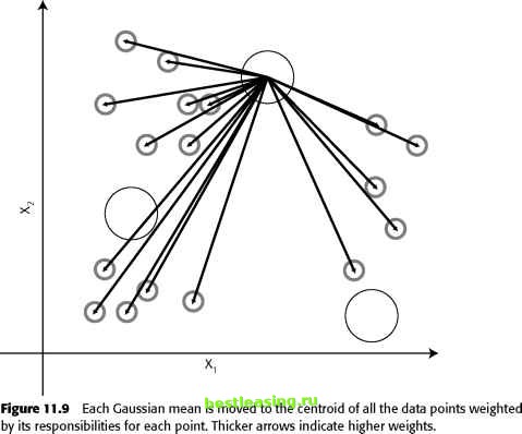 Gaussian mixture models are a probabilistic variant of K-means. The name comes from the Gaussian distribution, a probability distribution often assumed for high-dimensional problems. The Gaussian distribution generalizes the normal distribution to more than one variable. As before, the algorithm starts by choosing K seeds. This time, however, the seeds are considered to be the means of Gaussian distributions. The algorithm proceeds by iterating over two steps called the estimation step and the maximization step. The estimation step calculates the responsibility that each Gaussian has for each data point (see Figure 11.8). Each Gaussian has strong responsibility for points that are close to its mean and weak responsibility for points that are distant. The responsibilities are be used as weights in the next step. In the maximization step, a new centroid is calculated for each cluster taking into account the newly calculated responsibilities. The centroid for a given Gaussian is calculated by averaging all the points weighted by the responsibilities for that Gaussian, as illustrated in Figure 11.9. ![]() Figure 11.8 In the estimation step, each Gaussian is assigned some responsibility for each point. Thicker lines indicate greater responsibility. These steps are repeated until the Gaussians no longer move. The Gaussians themselves can change in shape as well as move. However, each Gaussian is constrained, so if it shows a very high responsibility for points close to its mean, then there is a sharp drop off in responsibilities. If the Gaussian covers a larger range of values, then it has smaller responsibilities for nearby points. Since the distribution must always integrate to one, Gaussians always gets weaker as they get bigger. The reason this is called a mixture model is that the probability at each data point is the sum of a mixture of several distributions. At the end of the process, each point is tied to the various clusters with higher or lower probability. This is sometimes called soft clustering, because points are not uniquely identified with a single cluster. One consequence of this method is that some points may have high probabilities of being in more than one cluster. Other points may have only very low probabilities of being in any cluster. Each point can be assigned to the cluster where its probability is highest, turning this soft clustering into hard clustering. ![]() Agglomerative Clustering The K-means approach to clustering starts out with a fixed number of clusters and allocates all records into exactly that number of clusters. Another class of methods works by agglomeration. These methods start out with each data point forming its own cluster and gradually merge them into larger and larger clusters until all points have been gathered together into one big cluster. Toward the beginning of the process, the clusters are very small and very pure-the members of each cluster are few and closely related. Towards the end of the process, the clusters are large and not as well defined. The entire history is preserved making it possible to choose the level of clustering that works best for a given application. An Agglomerative Clustering Algorithm The first step is to create a similarity matrix. The similarity matrix is a table of all the pair-wise distances or degrees of similarity between clusters. Initially, the similarity matrix contains the pair-wise distance between individual pairs of records. As discussed earlier, there are many measures of similarity between records, including the Euclidean distance, the angle between vectors, and the ratio of matching to nonmatching categorical fields. The issues raised by the choice of distance measures are exactly the same as those previously discussed in relation to the K-means approach. It might seem that with N initial clusters for N data points, N2 measurement calculations are required to create the distance table. If the similarity measure is a true distance metric, only half that is needed because all true distance metrics follow the rule that Distance(X,Y) = Distance(Y,X). In the vocabulary of mathematics, the similarity matrix is lower triangular. The next step is to find the smallest value in the similarity matrix. This identifies the two clusters that are most similar to one another. Merge these two clusters into a new one and update the similarity matrix by replacing the two rows that described the parent cluster with a new row that describes the distance between the merged cluster and the remaining clusters. There are now N - 1 clusters and N - 1 rows in the similarity matrix. Repeat the merge step N - 1 times, so all records belong to the same large cluster. Each iteration remembers which clusters were merged and the distance between them. This information is used to decide which level of clustering to make use of. Distance between Clusters A bit more needs to be said about how to measure distance between clusters. On the first trip through the merge step, the clusters consist of single records so the distance between clusters is the same as the distance between records, a subject that has already been covered in perhaps too much detail. Second and 1 2 3 4 5 6 7 8 9 10 11 12 13 14 15 16 17 18 19 20 21 22 23 24 25 26 27 28 29 30 31 32 33 34 35 36 37 38 39 40 41 42 43 44 45 46 47 48 49 50 51 52 53 54 55 56 57 58 59 60 61 62 63 64 65 66 67 68 69 70 71 72 73 74 75 76 77 78 79 80 81 82 83 84 85 86 87 88 89 90 91 92 93 94 95 96 97 98 99 100 101 102 103 104 105 106 107 108 109 110 111 112 113 114 115 116 117 118 119 120 121 122 123 124 125 126 127 128 129 [ 130 ] 131 132 133 134 135 136 137 138 139 140 141 142 143 144 145 146 147 148 149 150 151 152 153 154 155 156 157 158 159 160 161 162 163 164 165 166 167 168 169 170 171 172 173 174 175 176 177 178 179 180 181 182 183 184 185 186 187 188 189 190 191 192 193 194 195 196 197 198 199 200 201 202 203 204 205 206 207 208 209 210 211 212 213 214 215 216 217 218 219 220 221 222 |