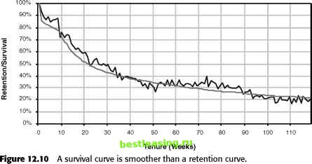 ![]() Actually, it is more than odd, it violates the very idea notion of retention. For instance, it opens the possibility that the curve will cross the 50 percent threshold more than once, leading to the odd, and inaccurate, conclusion that there is more than one median lifetime, or that the average retention for customers during the first 10 weeks after they start might be more than the average for the first 9 weeks. What is happening? Are customers being reincarnated? These problems are an artifact of the way the curve was created. Customers acquired in any given time period may be better or worse than the customers acquired in other time periods. For instance, perhaps 9 weeks ago there was a special pricing offer that brought in bad customers. Customers who started 10 weeks ago were the usual mix of good and bad, but those who started 9 weeks ago were particularly bad. So, there are fewer of the bad customers after 9 weeks than of the better customers after 10 weeks. The quality of customers might also vary due merely to random variation. After all, in the previous figure, there are over 100 time periods being considered-so, all things being equal, some time periods would be expected to exhibit differences. A compounding reason is that marketing efforts change over time, attracting different qualities of customers. For instance, customers arriving by different channels often have different retention characteristics, and the mix of customers from different channels is likely to change over time. Survival Hazards give the probability that a customer might stop at a particular point in time. Survival, on the other hand, gives the probability of a customer surviving up to that time. Survival values are calculated directly from the hazards. 100% 90% 80% 70% с 60% с 50% Ф 40% 30% 20% 10% 0% 0 1020304050607080901 00110 Tenure (Weeks) Figure 12.9 A retention curve might be quite jagged. At any point in time, the chance that a customer survives to the next unit of time is simply 1 - hazard, which is called conditional survival at time t (it is conditional because it assumes that the customers survived up to time t). Calculating the full survival at a given time requires accumulating all the conditional survivals up to that point in time by multiplying them together. The survival value starts at 1 (or 100 percent) at time 0, since all customers included in analysis survive to the beginning of the analysis. Since the hazard is always between 0 and 1, the conditional survival is also between 0 and 1. Hence, survival itself is always getting smaller-because each successive value is being multiplied by a number less than 1. The survival curve itself starts at 1, gently goes down, sometimes flattening, perhaps, out but never rising up. Survival curves make more sense for customer retention purposes than the retention curves described earlier. Figure 12.10 shows a survival curve and its corresponding retention curve. It is clear that the survival curve is smoother, and that it slopes downward at all times. The retention curve bounces all over the place. The differences between the retention curve and the survival curve may, at first, seem nonintuitive. The retention curve is actually pasting together a whole bunch of different pictures of customers from the past, like a photo collage pieced together from a bunch of different photographs to get a panoramic image. In the collage, the picture in each photo is quite clear. However, the boundaries do not necessarily fit together smoothly. Different pictures in the collage look different, because of differences in lighting or perspective- differences that contribute to the aesthetic of the collage. ![]() The same thing is happening with retention curves, where customers who start at different points in time have different perspectives. Any given point on the retention curve is close to the actual retention value; however, taken as a whole, it looks jagged. One way to remove the jaggedness is to focus on customers who start at about the same time, as suggested earlier in this chapter. However, this greatly reduces the amount of data contributing to the curve. Instead of using retention curves, use survival curves. That is, first calculate the hazards and then work back to calculate the survival curve. The survival curve, on the other hand, looks at as many customers as possible, not just the ones who started exactly n time periods ago. The survival at any given point in time t uses information from all customers. The hazard at time t uses information from all customers whose tenure is greater than or equal to that value (assuming all are in the population at risk). Survival, though, is calculated by combining all the information for hazards from smaller values of t. Because survival calculations use all the data, the values are more stable than retention calculations. Each point on a retention curve limits customers to having started at a particular point in time. Also, because a survival curve always slopes downward, calculations of customer half-life and average customer tenure are more accurate. By incorporating more information, survival provides a more accurate, smoother picture of customer retention. When analyzing customers, both hazards and survival provide valuable information about customers. Because survival is cumulative, it gives a good summary value for comparing different groups of customers: How does the 1-year survival compare among different groups? Survival is also used for calculating customer half-life and mean customer tenure, which in turn feed into other calculations, such as customer value. Because survival is cumulative, it is difficult to see patterns at a particular point in time. Hazards make the specific causes much more apparent. When discussing some real-world hazards, it was possible to identify events during the customer life cycle that were drivers of hazards. Survival curves do not highlight such events as clearly as 