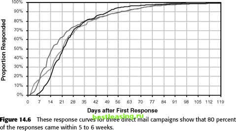 Who Are the Prospects? Understanding who prospects are is quite important because messages should be targeted to an audience of prospects. From the perspective of data mining, one of the challenges is using historical data when the prospect base changes. Here are three typical reasons why care must be used when doing prospecting: Geographic expansion brings in prospects, who may or may not be similar to customers in the original areas. Changes to products, services, and pricing may bring in different target audiences. Competition may change the prospecting mix. These are the types of situations that bring up the question: Will the past be a good predictor of the future? In most cases, the answer is yes, but the past has to be used intelligently. The following story is an example of the care that needs to be taken. One company in the New York area had a large customer base in Manhattan and was looking to expand into the suburbs. They had done direct mail campaigns focused on Manhattan, and built a model set derived from responders to these campaigns. What is important for this story is that Manhattan has a high concentration of very expensive neighborhoods, so the model set was biased toward the wealthy. That is, both the responders and nonresponders were much wealthier than the average inhabitant of the New York area. When the model was extended to areas outside Manhattan, what areas did the model choose? It chose a handful of the wealthiest neighborhoods in the surrounding areas, because these areas looked most like the historical respon-ders in Manhattan. Although there were good prospects in these areas, the model missed many other pockets of potential customers. By the way, these other pockets were discovered through the use of control groups in the mailing-essentially a random sampling of names from surrounding areas. Some areas in the control groups had quite high response rates; these were wealthy areas, but not as wealthy as the Manhattan neighborhoods used to build the model. WARNING Be careful when extending response models from one geographic area to another. The results may tell you more about similar geographies than about response. When Is a Customer Acquired? There is usually an underlying process in the acquisition of customers; the details of the process depend on the particular industry, but there are some general steps: Team-Ffy® Customers respond in some way and on some date. This is the sale date. In an account-based relationship, the account is created. This is the account open date. The account is used in some fashion. Sometimes, all these things happen at the same time. However, there are invariably complications-bad credit card numbers, misspelled addresses, buyers remorse, and so on. The result is that there may be several dates that correspond to the acquisition date. Assuming that all relevant dates are available, which is the best to use? That depends on the particular purpose. For instance, after a direct mail drop or an email drop, it might be interesting to see the response curve to know when responses are expected to come in, as shown in Figure 14.6. For this purpose, the sale date is most important date, because it indicates customer behavior and the question is about customer behavior. Whatever might cause the account open date to be delayed is not of interest. A different question would have a different answer. For comparing the response of different groups, for instance, the account open date might be more important. Prospects who register a sale but whose account never opens should be excluded from such an analysis. This is also true in applications where the goal is forecasting the number of customers who are going to open accounts. ![]() What Is the Role of Data Mining? Available data limits the role that predictive modeling can play. Predictive modeling is used for channels such as direct mail and telemarketing, where the cost of contact is relatively high. The goal is to limit the contacts to prospects that are more likely respond and become good customers. Data available for such endeavors falls into three categories: Source of prospect Appended individual/household data Appended demographic data at a geographic level (typical census block or census block group) The purpose here is to discuss prospecting from the perspective of data mining. A good place to begin is with an outline of a typical acquisition strategy. Companies that use direct mail or outbound telemarketing purchase lists. Some lists are historically very good, so they would be used in their entirety. For names from less expensive lists, one set of models is based on appended demographics, when such demographics are available at the household level. When such demographics are not available, neighborhood demographics are used instead in a different set of models. One of the challenges in direct marketing is the echo effect-prospects may be reached by one channel but come in through another. For instance, a company might send a group of prospects an email message. Instead of responding to the email on the Web, some respondents might call a call center. Or customers may receive an advertising message or direct mail, yet respond through the Web site. Or an advertising campaign may encourage responses through several different channels at the same time. Figure 14.7 shows an example of the echo effect, as shown by the correlation between two channels, inbound calls and direct mail. Another challenge is the funneling effect during customer activation described in the next section. WARNING The echo effect may artificially under- or overestimate the performance of channels, because customers inspired by one channel may be attributed to another. Customer Activation Once a prospect has exhibited an interest, there is some sort of activation process. This may be as simple as a customer filling out a registration form on a Web site. Or, it might involve a more lengthy approval process, such as