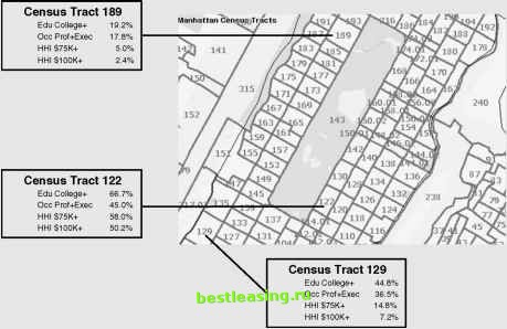 When comparing customer profiles, it is important to keep in mind the profile of the population as a whole. For this reason, using indexes is often better than using raw values. Chapter 11 describes a related notion of similarity based on the difference between two angles. In that approach, each measured attribute is considered a separate dimension. Taking the average value of each attribute as the origin, the profile of current readers is a vector that represents how far he or she differs from the larger population and in what direction. The data representing a prospect is also a vector. If the angle between the two vectors is small, the prospect differs from the population in the same direction. Measuring Fitness for Groups of Readers The idea behind index-based scores can be extended to larger groups of people. This is important because the particular characteristics used for measuring the population may not be available for each customer or prospect. Fortunately, and not by accident, the preceding characteristics are all demographic characteristics that are available through the U.S. Census and can be measured by geographical divisions such as census tract (see the sidebar, Data by Census Tract ). The process here is to rate each census tract according to its fitness for the publication. The idea is to estimate the proportion of each census tract that fits the publications readership profile. For instance, if a census tract has an adult population that is 58 percent college educated, then everyone in it gets a fitness score of 1 for this characteristic. If 100 percent are college educated, then the score is still 1-a perfect fit is the best we can do. If, however, only 5.8 percent graduated from college, then the fitness score for this characteristic is 0.1. The overall fitness score is the average of the individual scores for each characteristic. Figure 4.1 provides an example for three census tracts in Manhattan. Each tract has a different proportion of the four characteristics being considered. This data can be combined to get an overall fitness score for each tract. Note that everyone in the tract gets the same score. The score represents the proportion of the population in that tract that fits the profile. DATA BY CENSUS TRACT The U.S. government is constitutionally mandated to carry out an enumeration of the population every 10 years. The primary purpose of the census is to allocate seats in the House of Representatives to each state. In the process of satisfying this mandate, the census also provides a wealth of information about the American population. The U.S. Census Bureau (www.census.gov) surveys the American population using two questionnaires, the short form and the long form (not counting special purposes questionnaires, such as the one for military personnel). Most people get the short form, which asks a few basic questions about gender, age, ethnicity, and household size. Approximately 2 percent of the population gets the long form, which asks much more detailed questions about income, occupation, commuting habits, spending patterns, and more. The responses to these questionnaires provide the basis for demographic profiles. The Census Bureau strives to keep this information up to date between each decennial census. The Census Bureau does not release information about individuals. Instead, it aggregates the information by small geographic areas. The most commonly used is the census tract, consisting of about 4,000 individuals. Although census tracts do vary in size, they are much more consistent in population than other geographic units, such as counties and postal codes. The census does have smaller geographic units, blocks and block groups; however, in order to protect the privacy of residents, some data is not made available below the level of census tracts. From these units, it is possible to aggregate information by county, state, metropolitan statistical area (MSA), legislative districts, and so on. The following figure shows some census tracts in the center of Manhattan: ![]() DATA BY CENSUS TRACT (continued) One philosophy of marketing is based on the old proverb birds of a feather flock together. That is, people with similar interests and tastes live in similar areas (whether voluntarily or because of historical patterns of discrimination). According to this philosophy, it is a good idea to market to people where you already have customers and in similar areas. Census information can be valuable, both for understanding where concentrations of customers are located and for determining the profile of similar areas.
