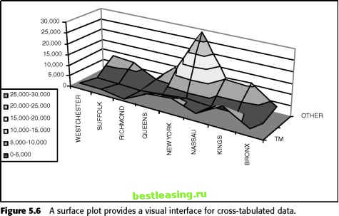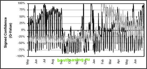 -5 -4 -3 -2 -1 0 1 2 3 4 5 Z-Value Figure 5.4 The tail of the normal distribution answers the question: What is the probability of getting a value of z or greater? Figure 5.5 shows the signed confidence for the data shown earlier in Figures 5.2 and 5.3, using the two-tailed probability. The shape of the signed confidence is different from the earlier shapes. The overall stops bounce around, usually remaining within reasonable bounds. The pricing-related stops, though, once again show a very distinct pattern, being too low for a long time, then peaking and descending. The signed confidence levels are bounded by 100 percent and -100 percent. In this chart, the extreme values are near 100 percent or -100 percent, and it is hard to tell the difference between 99.9 percent and 99.99999 percent. To distinguish values near the extremes, the z-values in Figure 5.3 are better than the signed confidence. ![]() Figure 5.5 Based on the same data from Figures 5.2 and 5.3, this chart shows the signed confidence (q-values) of the observed value based on the average and standard deviation. This sign is positive when the observed value is too high, negative when it is too low. Cross-Tabulations Time series are an example of cross-tabulation-looking at the values of two or more variables at one time. For time series, the second variable is the time something occurred. Table 5.1 shows an example used later in this chapter. The cross-tabulation shows the number of new customers from counties in southeastern New York state by three channels: telemarketing, direct mail, and other. This table shows both the raw counts and the relative frequencies. It is possible to visualize cross-tabulations as well. However, there is a lot of data being presented, and some people do not follow complicated pictures. Figure 5.6 shows a surface plot for the counts shown in the table. A surface plot often looks a bit like hilly terrain. The counts are the height of the hills; the counties go up one side and the channels make the third dimension. This surface plot shows that the other channel is quite high for Manhattan (New York county). Although not a problem in this case, such peaks can hide other hills and valleys on the surface plot. Looking at Continuous Variables Statistics originated to understand the data collected by scientists, most of which took the form of continuous measurements. In data mining, we encounter continuous data less often, because there is a wealth of descriptive data as well. This section talks about continuous data from the perspective of descriptive statistics. Table 5.1 Cross-tabulation of Starts by County and Channel