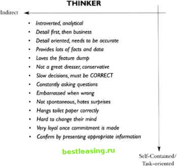 dress is usually dark blue and conservative, nothing flashy or terribly stylish. If a Director is wearing a flashy tie you can feel safe in asking, Nice tie, who bought it for you? They drive conservative, functional cars such as a Reliant or a Taurus. Dont touch a Director, in fact, handshakes are unnecessary. They like their personal space, We are here to do business, not get married! A Director is not concerned about the relationship, they just care about your performance as a professional and how the performance of your product or service will contribute to the bottom line. Dont have an emotional outburst (crying) in a Directors office. He or she will be unmoved and unimpressed. Get yourself together-then carry on with the conversation. No sniffling allowed. Remember, Directors have a need for power and control that cannot be ignored by a pushy sales representative. They are motivated by bottom-line detail. In summary: ![]() DIRECTOR Spontaneous Sntnmrtzt), shoves tinic emalion Business first rntrybt pCr[y Ahrays asking whats the point? Get to tne point quickly no stKiahiing Focused on goofc, objectives and pelting the task done Ctriitcrtatrte dresser, nothing IfasJry Handihoivtt art илпкеяагу Wants bottom-lint dnall, ovoid the feature dump Fan densrorw, $р9л№ №$ Cosn or g-ift oertficoDes at rfts, г)(ч shopping Рйог Jiste/ier Needs to be in CONTROL in charge Very pjujn office, clean desk, nothing on watts Gonftjwi ifi*. sale with bottnm4ine detail Thinker The two main components of a Thinker are indirect (slow decisions) and self-contained (introvert). These individuals are typically your engineers, accountants, and computer programmers. Its information first, then business. You dont have much hope of doing business with them until you deliver all the required data for them to make an informed, intelligent decision. Thinkers hate to be wrong-it drives them crazy when mistakes are made. Thats why they are indirect, not making decisions quickly, avoiding mistakes. They are very detailed-oriented and precise, often guided by the letter of the law, versus the spirit of the law. Presentations to Thinkers must be logical, accurate, and reliable. Thinkers are the ones who will lure you into a feature dump. They love it. Rather than spewing reams of information, ask them what they would like to see. They will tell you whats important to them so make sure you provide it. I suggest you openly acknowledge their need for information, then ask, What specific information would you need to see to build your confidence to buy from me? Build confidence by presenting ![]() Expect Thinkers to compare your product or service to the competition. Seldom will they accept information at face value. Impulse buying is very uncomfortable for them. They prefer to research manufacturers specifications and converse with experts in that field. Dont argue with them; there isnt much chance of winning. Why? Because they have thoroughly researched the subject and have the data to back themselves up, and they will pursue the argument until they are victorious. In some cases Thinkers attitudes are: Im right and youre wrong but its your right to be wrong. Of the four styles, Thinkers are the ones least concerned with dress-its not important. Their clothes are a bit worn and generally a bit out of style. They sometimes wear a plastic pocket protector full of Bic pens and use duct tape to fix their glasses. I know some Thinkers who insist on hanging toilet paper correctly, exercising proper toilet paper management, so that it rolls off the top. This is an important detail to Thinkers and in fact, they have been known to correct it when they get home. They sometimes even correct it at a friends home, just to help out. It has been the topic of many heated matrimonial discussions. Of course the Directors are thinking: Who cares? Im happy if theres paper on the back of the toilet. Thinkers tend to be packrats, never throwing anything out. Their garages and basements are jammed with old stuff because, You just never know when it might be useful. Heck, they even have their university text books and notes somewhere in the basement. Thinkers focus on two important aspects of selling: accuracy and an eye to detail. They are particular on their paperwork, which is appreciated by internal customers. They tend to do a job right the first time, whereas Socializers may have to redo it several times as they often overlook important details. In summary: appropriate information guided by the Thinkers feedback. Dumping wheelbarrels of data in their office for their perusal only lengthens the sales cycle. Edit your dialogue with data that are relevant and appropriate to the Thinker. ! hays to go. Another role* rvp just Hp wHb very important information. ![]() Relater The two main components of a Relater are indirect (slow decisions) and open (extrovert). These individuals are very sensitive, often taking business issues personally. They are very intuitive, accurately reading peoples nonverbal behaviors. Relaters are big-time team players and they encourage harmony among the team, be it at work, socially, or at home with their family. Relaters are emotional, empathetic people who are moved to tears easily and can be oversensitive. Take a Relater to see Titanic and watch what happens. They cry very easily. (Yes, even male Relaters.) Directors would be inclined to think, Why are you crying, you knew the darn thing sank in 1912. Relaters are often appalled at the apparent apathy of Directors, taking their verbal and nonverbal responses literally. Relaters hate conflict of any sort. They go to great lengths to avoid hassles, talking their way out of conflict. They are very conforming and go with the flow versus doing it solo. Relaters are good listeners and ask more than tell. Relaters are motivated by the relationship, hoping everybody will like them. They must be popular and tend to make decisions slowly (indirect) so as to