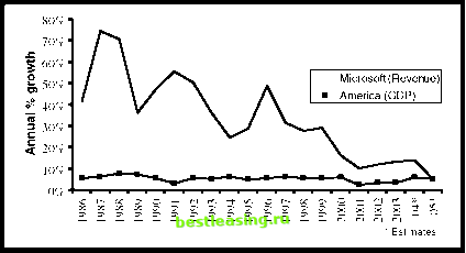 laid all the economists in the world end to end that would be a good thing. To counter this, lets make the clear statement and then explain the reasoning. Fact: Corporate profits have been growing above their natural speed limit for a long time. The future for stocks cannot be as bright as the past. On the road to this conclusion we start at the basics-with bacteria. Almost every biology textbook contains a section that describes bacterial growth rates in terms of something like this: Some bacteria can divide every two hours. If this replication pace were sustained for several weeks, the offspring of one bacterium would weigh more than the universe. Continuing our Arnold theme, bacteria could mock Internet companies by saying, Yahoo!, youre growing very slowly today. Left unconstrained, one bacterium would become 4,096 in one day, over 16 million in two days, over 60 billion in 3 days, and enough to weigh more than the earth in a couple of weeks. So bacteria can grow really fast. Over the long run, what has been the growth rate of bacteria? The surprising answer: zero. Bacteria have been around for a really long time. Doing the simple mathematical calculation of the annual growth rate over their history, bacterial growth rates are infinitesimally greater than zero. An unavoidable mathematical law causes the contrast between doubling every two hours and a long-term growth rate of zero. At least for the last several billion years, the earth itself has not changed significantly in weight. The long-run rate of growth of the earth has therefore been zero. Thus, anything that is a subset of the earth, including bacteria, must have a long-run growth rate of no more than zero. This is a mathematical truism. A part of a system cannot sustain a higher growth rate than the system for an indefinite time. Just as bacteria are part of the earth, any single company is part of the global economy. Thus, over the long run, no company can grow faster than the worlds economy. For example, Figure 8.5 shows the growth in ![]() FIGURE 8.5 Microsofts Growth Rate Has Slowed toward That of the U.S. Economy Sources: Microsoft, U.S. Department of Commerce, Congressional Budget Office Microsofts revenues from its public debut until today as compared with the growth of the U.S. economy. (The best graph would use global economy growth; the chart uses the United States because the story is the same and the U.S. statistics are more reliable.) When Microsoft was a young company, its growth rate was spectacular. Over the years, however, that growth rate has slowed and now is much closer to that of the entire country. Over the long run Microsoft cannot grow faster than the economy. In fact, the gap is projected to disappear in 2005 (Figure 8.5).12 Whenever a company, or a set of companies, is growing faster than the economy, that growth rate is unsustainable. The relevant question is not if growth will slow to the natural speed limit but when growth will slow. Both corporate revenue and profits are subject to the same natural speed limit. Neither revenue nor profits can grow faster than the economy indefinitely. Figure 8.6 shows, however, that U.S. corporate profits have been growing faster than the economy.