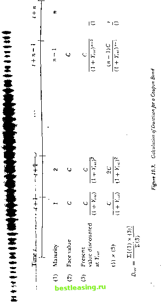 i iii iii ihiii .111 ii lillls nine / t + n Hity I (и + 1 )->crioil -/ ., i , bond Sell/> + [)p, r +L (-period bonds Im I P, Net 0 Figure 10.2. C.nsli flaws in a Fontvird Transaction Moving to logs Cor simplicity, die n-pcriod-ahcad log forward rale is jni = Im - 1>нл\.1 = ( + I) V,h-1.i - y < = \>и l.i + (> -1, i ~ y i) = >/ + ( + 1 )(vM+i. t-y t). (10.1.8) Equation (10.1.8) shows that the forward rate is positive whenever discount bond prices fall with maturity. Also, the forward rale is above both the n-period and the (n + l)-period discount bond yields when the (n + l)-period yield is above the н-period yield, that is, when the yield curve is upward-sloping.7 This relation between a yield lo maturity and the instantaneous lorward rale at thai maiuriiy is analogous lo the relation between marginal and average cost. The yield lo maturity is the average cost of borrowing for i periods, while the forward rale is the marginal cost of extending the time period of the loan. Figure 10.1 illustrates the relation between the forward-rate curve (shown as a dashed line) and the yield curve (a solid line). The forward-rate curve lies above the yield curve when die yield curve is upward-sloping, and below it when the yield curve is downward-sloping. The two curves cross when the yield curve is Hat. These are the standard properties of marginal and average cost curves. When the cost of a marginal unit exceeds the cost of an average unit then the average cost increases with the addition of the 7 As (In- lime imii sin inks n t.ilnr it> lln- In nut in.iliuily n. ihe loi intil.i (lll.l.H) appi n.u lies / i = Y i S и ilT >l i. м-pci inil vii lil plus ii times lite stupe >! tlx- vielil i uric at maturity и. 10.1. Hasic Concepts marginal unit, so the average cost rises when the marginal cost is above the average cost. Conversely, the average cost falls when the marginal cost is below the average cost. J 10.1.2 Coupon Bonds As we have already emphasized, a coupon bond can be viewed as a package of discount bonds, one with face value equal to the coupon for each date at which a coupon is paid, and one with the same face value and maturity as the coupon bond itself. Figure 10.3 gives a time line to illustrate the time pattern of payments on a coupon bond. The price of a coupon bond depends not only on its maturity n and the dale t, but also on its coupon rate. To keep notation as simple as possible, we define a period as the time interval between coupon payments and С as the coupon rate per period. In the case of US Treasury bonds a period is six months, and С is one half the conventionally quoted annual couponlrate. We write the price of a coupon bond as Pcnt to show its dependence on the coupon rate. The per-period yield to maturity on a coupon bond, Ycnl, is defined as that discount rate which equates the present value of the bonds payments to its price, so we have P = (Г + о + --+о- (10Л-9) In the case of US Treasury bonds, where a period is six months, Ycnt is the six-month yield and the annual yield is conventionally quoted as twice Ytnl. Equation (10.1.9) cannot be inverted to get an analytical solution for Ycnt- Instead it must be solved numerically, but the procedure is straightforward since all future payments are positive so there is a unique positive real solution for Ycn,.* Unlike the yield to maturity on a discount bond, the yield to maturity on a coupon bond does not necessarily equal the per-period return if the bond is held to maturity. That return is not even defined until one specifies the reinvestment strategy for coupons received prior to maturity. The yield to maturity equals the per-period return on the coupon bond held to maturity only if coupons are reinvested at a rate equal tothe yield to maturity. The implicit yield formula (10.1.9) simplifies in two important special cases. First, when Prnt = 1, the bond is said to be selling at par. In this case the yield just equals the coupon rate: Ycnl = C. Second, when maturity n Wit Ii negative future payments, tliere ran be multiple positive real solutions to (10.1.9). In the analysis of investment projects, the discount rate thai equates the present value of a project to its cost is known as the internal mlr of rrlum. When projects have some negative cash Hows in the future, there can be multiple solutions for the internal rate of return. ![]() is infinite, ihe bond is called a consul or fmpHuity. In this ease the yield just equals die ratio of the bond price lo the coupon rate; )rtV), = C/lr00l. Duration and Immunization For discount bonds, maturity measures the length of time that a bondholder has invested money. But for coupon bonds, maturity is an imperfect measure of this length of lime because much of a coupon bonds value comes from payments that are made before maturity. Macaidays duration, due to Macaulay (1938), is intended lo be a better measure; like maturity, its units are time periods. To understand Macaulays duration, think of a coupon bond as a package of discount bonds. Macaidays duration is a weighted average of the maturities of the underlying discount bonds, where the weight on each maturity is the present value of the corresponding discount bond calculated using the coupon bonds yield as the discount rale:1 -.111- , I i , (1 + ) ) (It У. У (H T.,.,r Il nl - ----- i in ,} nit rv i (i + ); i (i + >, ,r (10.1.10) The maturity of the first component discount bond is one period and this receives a weight of C/( 1 + Ytnl), the present value of this bond when Yr, is the discount rate; the maturity of the second discount bond is two and this receives a weight of C/(l + Ytn,)1; and so on until the last discount bond of maturity n gels a weight of (1 + (.)/(1 + Y, ,) . To convert ibis into an average, wc divide by the sum of the weights C/(I -f >> ,) -f C/(l + Yt ,f + + (14- C)/(l + У ) , which from (10.1.9) is just the bond price / . These calculations are illustrated graphically in Figure 10.3. When С = 0, th