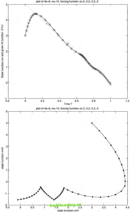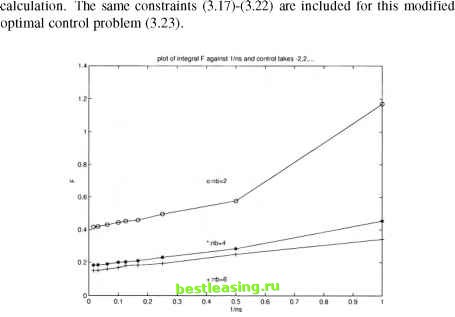 ![]() Set 3 for nb = 6 ![]() In this group of graphs, the pattern of control is 2, -2,2, -2,.... Like the previous experiment, this experiment starts from nb = 2, ns = 1 and increases nb and ns gradually. As expected, better approximation is obtained by increasing either nb or ns. Unexpected answers were also found at certain points. A small perturbation is helpful to gain the accurate results. Here, we only put the attention on the comparison of these two different patterns of the control. From Table 3.1 and Table 3.2, it is found that the values of the objective function of two different control patterns at starting points (nb = 2, ns = 1) have big differences. Pattern -2,2,-2,2,... gives much better result than pattern 2, -2, 2, - 2, It is an interesting phenomenon that when nb and ns become very big (more jumps and better gradient), the results of the objective function with different control patterns are very close. We can conclude that when optimal control jumps infinitely and the integration calculation has more subdivisions of the time period, the better fit for the problem can be reached whatever pattern of the optimal control is used. Figure 3.1 and Figure 3.2 show the results of the objective function against 1/ns at two different control patterns. The value of the objective function tends to zero when the number nb of subdivisions increases. It is also confirmed that a greater number of subdivisions of the time interval will lead to a better integral calculation. The three lines in each figure also show that more jumps of the control will give better approximation. In the next figure, a cost is added to the objective function. A complete description of the cost of switching control has been discussed in Chapter 2. In this chapter, a cost is only attached to the number of large subintervals concerned with the control jumping, shown as follows: K is the cost of changing control, nb is the number of large subintervals. In this computation, K is set to be 0.01, and ns = 64 for the accuracy of the ![]() Figure 3.1. Plot of integral F against 1/ns at ut=-2,2 PloloF integral (against 1/ns and control takes 2.-2. ![]() 1/ns Figure 3.2. Plot of integral F against 1/ns at ut=2,-2 1 2 3 4 5 6 7 8 9 10 11 12 13 14 15 16 17 18 19 20 21 22 23 24 25 26 27 28 [ 29 ] 30 31 32 33 34 35 36 37 38 39 40 41 42 43 44 45 46 47 48 49 50 51 52 53 54 55 56 57 58 59 60 61 62 63 64 65 66 67 |
