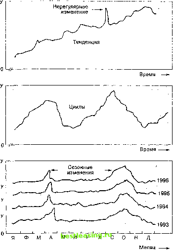 jio подчеркнуть: прогноз спроса должен быть основан на анализе временных рядов прошедшего спроса, а не объема продаж. Объем продаж неверно отразит спрос, если только спрос не окажется меньше, чем количество предложенных к продаже товаров или услуг. Аналогично, отгрузки не могут реально отразить спрос, если имеются отставания в исполнении заказов; график отгрузок не будет отвечать графику спроса. ![]() Рис. 10-1. Тенденции, сезонные изменения, циклы, случайные и нерегулярные изменения Методы усреднения Архивные данные обычно содержат определенное количество случайных изменений или искажений ( помех ), которые могут смазывать картину систематического движения данных. Эти искажения являются результатом объединенного влияния многих - и даже очень многих - относительно незначительных факторов, и не могут быть достоверно предсказаны. В идеале, нужно было бы полностью удалить из данных любые случайности и оставить только настоящие изменения - такие как изменения чу ровне спроса (скачки). Однако на практике, как правило, невозможно разграничить эти два вида изменений. В лучшем случае, можно надеяться на то, что небольшие изменения являются случайными, а большие - действительными (закономерными). Идеал Ступенчатое Постепенное изменение изменение Рис. 10-2. Усреднения трех возможных вариантов закономерности Прогнозы, составленные методом усреднения, отражают последние показатели временного ряда (например, среднее значение за последние несколько периодов). Эти методы работают лучше всего, когда данные склонны изменяться вокруг некоторого среднего значения, хотя могут рассматриваться и резкие изменения (скачки), а также постепенные плавные изменения в уровне ряда. В данном разделе описаны три метода усреднения: 1. Наивные прогнозы 2. Скользящие средние значения 3. Экспоненциальное сглаживание Наивные прогнозы. Самая простая методика прогнозирования - наивный метод. Наивный прогноз для любого периода равняется фактическому значению предыдущего периода. р я 5 г< *;с--, -.v.- Например, если спрос на последней неделе был 50 I Наивный прогноз - про- единиц, наивный прогноз на следующую неделю - I равен %Ткому !начТ- j 0 единиц. Аналогично, если спрос оказывается I нию предыдущего периода. \ 54 единицы, то прогноз на следующую неделю тоже со- ставит 54 единицы. Хотя на первый взгляд наивный подход может показаться слишком упрощенным, он, тем не менее, вполне законный инструмент прогнозирования. Рассмотрите его преимущества: он не требует фактически никаких затрат, быстр и прост в подготовке, потому что анализ данных отсутствует, его легко понять. Основной недостаток данного метода - неспособность обеспечить высокую точность прогноза. Однако, если результирующая точность приемлема, то этот подход заслуживает серьезного рассмотрения. Кроме того, даже если другие методы прогнозирования дают большую точность, они будут почти всегда иметь и большую стоимость. Точность наивного прогноза может служить основой для оценки соотношения затраты/точность для других методов. Таким образом, менеджер должен ответить на вопрос: стоит ли повышенная точность другого метода дополнительных затрат, необходимых для ее достижения? Методы усреднения сглаживают некоторые колебания во временном ряде, так как отдельные точки максимума и минимума в данных компенсируют друг дру