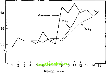 Обратите внимание, что в скользящем среднем значении, при поступлении каждого нового фактического значения, прогноз модифицируется; добавляется самое новое значение и удаляется самое старое, а затем заново вычисляется среднее. Следова- 1 тельно, прогноз скользит , отражая только самые последние значения. При вычислении скользящего среднего значения, столбец возраста в пример 1 не включен; он показан, чтобы проиллюстрировать используемую методику. Вместо этого, включение столбца скользящего общего (который дает сумму п самых новей-щих значений, из которой и будет вычисляться среднее) помогло бы вычислениям. Обновлять скользящее общее значение относительно просто: вычтите самое старое значение из самого нового значения и прибавьте полученный показатель к скользящему общему для каждой модификации. На рисунке 10-3 показан прогноз скользящего среднего значения за три периода, подготовленный относительно фактического спроса более чем за 31 период. Обратите внимание, как прогноз скользящего среднего значения отстает от фактических значений и как сглажены спрогнозированные значения по сравнению с фактическими. Q. С 3-х цикличное скользящее среднее значение (МА) Спрос ![]() 15 Период Рис. 10-3. Прогноз скользящего среднего значения отстает от реальных показателей; его значения более сглажены по сравнению с фактическими Скользящее среднее значение может включать столько периодов данных, сколько необходимо. Определяя число периодов, нужно принять во внимание, что число точек, по которым производится усреднение, определяет его чувствительность для каждой новой точки данных: чем меньше показателей усредняется, тем более чувствительно среднее. (См. рис. 10-4.) Если чувствительность важна, то следует использовать скользящее среднее с относительно небольшим числом точек. Это обеспечит большую чувствительность, например, к ступенчатым изменениям в данных, но это также сделает прогноз чувствительным даже к случайным изменениям. Наоборот, скользящие средние значения, основанные на большом количестве точек данных, будут больше сглаживать, но меньше реагировать на реальные изменения. Иными словами, необходимо выбирать между высокой чувствительностью к случайным изменениям данных - и более медленной реакцией на изменения. Преимущество прогноза скользящего среднего значения заключается в том, что его легко рассчитать и легко понять. Возможным недостатком может стать то, что все о о о. п ![]() Рис. 10-4. Чем больше периодов в скользящем среднем значении, тем больше прогноз запаздывает относительно изменений в данных значения в среднем учитываются на равных. Например, в скользящем среднем значении с 10 периодами, каждое значение имеет вес 1/10. Следовательно, самое старое значение имеет тот же коэффициент значимости, что и самое новое. Если в ряде происходит изменение, то прогноз скользящего среднего значения может реагировать на него достаточно медленно, особенно если имеется большое количество точек усреднения. Уменьшение числа усредняемых значений увеличивает коэффициент значимости более поздних показателей, но это происходит за счет потери потенциальной информации от более ранних значений. Взвешенное среднее подобно скользящему среднему значению - за исключением того, что оно присваивает больший коэффициент значимости самым поздним по