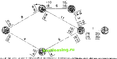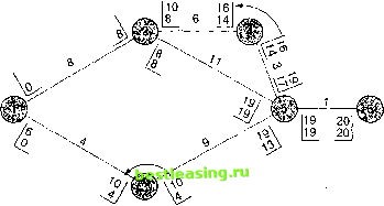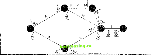 Вычисление времени ES и EF Вычислению самого раннего начального и конечного времени помогают два простых правила: 1. Самое раннее конечное время для любого действия равно его самому раннему начальному времени плюс его ожидаемая продолжительность t: EF=ES+t (16-1) 2. ES для действий в узлах с одной входящей стрелкой равно EF входящей стрелки. ES для действий, выходящих из узлов со многими входящим стрелками, равен самому большому EF входящей стрелки. Вычисление времени LS и LF Вычислению самого позднего начального и конечного времени помогают два правила: 1. Самое позднее начальное время для каждого действия равно его самому позднему конечному времени минус время продолжительности этого действия: LS=LF-t (16-2) 2. Для узлов с одной выходящей стрелкой, LF для стрелок, входящих в этот узел, равно LS выходящей стрелки. Для узлов со многими выходящими стрелками, LF для стрелок, входящих в этот узел, равно наименьшему LS выходящих стрелок. Нахождение времени ES и EF предполагает шаг вперед по сети; нахождение времени LS и LF предполагает шаг назад по сети. Следовательно, мы должны начать с EF последнего действия и использовать это время как LF для последнего действия. Тогда мы получим LS для последнего действия, вычитая его ожидаемую продолжительность из eroLF. ПРИМЕР 3 1 Вычислите самые поздние конечное и начальное время для диаграммы предшест- вования, показанной в примере 2. Решение: К скобкам на диаграмме нужно добавить время LS и LF. LS ES LF EF Начинаем, приравнивая время LF последнего действия к его EF. Таким образом, LF5.6 = EF5.6 = 20 недель. Получим время LS для действия 5-6, вычитая продолжительность действия t из времени LF: LS5.6 = LF5.6-t = 20-1 = 19. Нанесите эти значения на диаграмму: ![]() Время ES=19 для действия 5-6 становится теперь временем LF для каждого из действий, которые предшествуют действию 5-6. Это позволяет определить время LS для каждого из этих действий: вычтите продолжительность действия из LF, чтобы получить время LS для этого действия. Время LS для действия 3-5 : 19-9 = 10. ![]() Затем, LS=16 действия 4-5 становится LF для действия 2-4, а LS=10 действия 3-5 становится LF для действия 1-3. Используя эти значения, находим LS для каждого из этих действий, вычитая продолжительность действия из времени LF. ![]() LF для действия 1 -2 является наименьшим из двух времен LS предшествующих действий. Следовательно, время LF для действия 1-2 будет 8. Причина, почему мы используем наименьшее время, заключается в том, что действие 1-2 должно закончиться за время, которое позволит всем последующим действиям начаться не позднее, чем их время LS. Когда время LF действия 1 -2 определено, находим его время LS, вычитая продолжительность действия, равную 8, из времени LF, также равного 8. Следовательно, время LS =0. ![]()