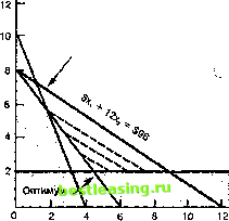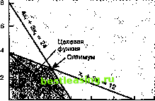 Целевая функция ![]() Рис. 5п-8. Оптимум находится в последней точке соприкосновения линии целевой функции, когда она перемещается в направлении начала координат Недостаток и избыток Связывающее ограниче- ние - ограничение, которое формирует оптимальную угловую точку области возможных решений. штттштттшшшштшшвтжш Недостаток - когда оптимальные значения переменных решения подставляю юя в ограничение типа S и результирующая величина меньше, чем величина пра-I вой части. Если ограничение формирует угловую точку оптимума в области возможных решений, то оно называется связывающим ограничением (binding constraint). В действительности, оно ограничивает значение целевой функции; если ограничение будет слабее (менее жестким), то возможно улучшение решения. Для ограничения, которое не является связывающим, ослабление ограничения не окажет действия на решение. Если подставить оптимальные значения переменных в левую часть связывающего ограничения, результирующее значение будет точно равно значению правой части ограничения. Однако в случае с необязательным ограничением будет иметь место различие. Если левая часть больше, чем правая, то говорят, что имеется избыгок; если левая часть меньше правой, то имеется недостаток. Недостаток может возникать только в ограничении типа <; это та величина, на которую левая часть меньше правой, когда оптимальные значения переменных подставляются в левую часть. Избыток может возникать только в ограничениях типа >; это величина, на которую левая часть больше правой, когда оптимальные значения переменных подставляются в левую часть. Например, предположим, что оптимальные значения для модели: xj = 10 и Х2 = 20. Одно из ограничений имеет вид: 3x1 +2x2 < 100 Подставляя оптимальные значения в левую часть, получим: 3(10)+ 2(20) =70 Так как ограничение имеет тип < различие между значениями 100 и 70 (т.е.ЗО) - это недостаток. Предположим, что оптимальные значения xj = 20 и Х2 = 20. Подстановка этих значений в левую часть ограничения даст 3(20) + 2(20) = 100. Т.к. левая и правая части равны (недостаток равен 0), имеет место связывающее ограничение. Избыток - когда оптималь- ные значения переменных решения подставляются в ог- раничение типа > и результи- 1 рующая величина больше, чем величина правой части. 1 Теперь рассмотрим ограничение: 4Х1+Х250 Предположим, что оптимальные значения Xj = 10 и Х2 = 15; подставляя их в левую часть, получим: 4(10)+ 15=55 Так как это ограничение типа >, разность между левой и правой частями является избытком. Если оптимальные значения были xj = 12 и Х2 = 2, то в результате подстановки левая часть будет равна 50. Следовательно, ограничение будет связывающим, а излишка не будет (т.е. излишек равен 0). Симплексный метод Симплекс - алгоритм ли- ш нейного программирования, с помощью которого можно I решать задачи, содержащие более двух переменных. Симплексный метод - универсальный алгоритм линейного программирования, который широко используется для решения крупномасштабных задач. Хотя ему недостает простоты и наглядности графического подхода, его способность решать задачи с более чем 2 переменными делает его чрезвычайно ценным для решения многих проблем управления производством. Симплексная методика включает ряд итераций (повторов); проводятся последовательные усовершенствования, до тех пор пока не будет достигнуто оптимальное решение. Методика его требуе