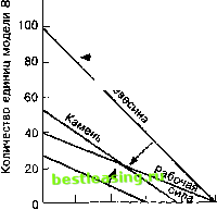 Распечатка начинается исходной задачей и оптимальными значениями переменных. Оптимальные значения переменных даны сначала, под заголовком VARIABLE (ПЕРЕМЕННЫЕ), за ними следуют оптимальные значения переменных резерва, которые перечислены под заголовком ROW (СТРОКА). Справа от оптимальных значений переменных расположена колонка REDUCED COSTS (РЕДУЦИРОВАННАЯ СТОИМОСТЬ), а справа от оптимальных значений резерва - колонка DUAL PRICES (ДВОЙНЫЕ ЦЕНЫ). Здесь строка 2 относится к S], строка 3 относится к S2, и строка 4 относится к S3. Двойные цены равны значениям в строке C-Z конечной таб- ЛЯДЫ (см.таблицу 5п-11). Не забудьте, что для переменных в решении, значения C-Z буду! Рви нулю. Отличная от нуля редуцированная стоимость затем появится, если переменная не присутствовала в решении. Ненулевая редуцированная стоимость указывает значение, на которое коэффициент при переменной целевой функции может увеличиваться, не входя в решение. Так, если редуцированная стоимость 2,00, то переменная этой целевой функции увеличится на более чем на 2,00, чтобы быть в решении, - если задача содержит одно изменение. Двойные цены - это теневые показатели для переменных избытка или резерва (в данном случае, резервные переменные). В оставшейся части распечатки содержатся результаты анализа чувствительности: сначала диапазоны целевого коэффициента (диапазоны оптимальности), затем диапазон правой части ограничений (диапазон выполнимости). Для каждой переменной, CURRENT VALUE (ТЕКУЩЕЕ ЗНАЧЕНИЕ) относится к коэффициенту целевой функции; следующий столбец указывает количество возможного увеличения, а далее следующий столбец-количество возможного уменьшения, которые не изменят оптимального значения переменных, находящихся в решении. Для правосторонних диапазонов приведены переменные резерва (фактически, строка 2 относится здесь к Sj, строка 3 к S2, и строка 4 к S3). ТЕКУЩЕЕ ЗНАЧЕНИЕ относится к начальным правосторонним значениям ограничений. Следующие два столбца показывают значения, на которые можно изменить правую часть ограничений, чтобы она оставалась в пределах диапазона выполнимости. Ключевые термины Графическое линейное программирование Диапазон выполнимости Диапазон оптимальности Значения опорной строки Избыток Искусственная переменная Новая опорная строка Область возможных решений Ограничения Параметр Переменные решения Резерв Связывающее ограничение Симплекс Таблица Теневые цены Целевая функция Цель graphical linear programming range of feasibility range of optimality row pivot values surplus artificial variable new pivot row feasible solution space constraints parameter decision variables slack binding constraint simplex tableau shadow prices objective function objective Решение задач ЗАДАЧА 1 Небольшая строительная компания специализируется на строительстве и продаже домов на одну семью. Компания предлагает два основных типа домов, модель А и модель В. Дома модели А требуют 4000 часов рабочего времени, 2 тонны камня и 2000 кв.футов пиломатериалов. Дома модели В требует 10.000 часов рабочего времени, 3 тонны камня и 2000 кв.футов пиломатериалов. Из-за больших сроков по- ставки материалов и дефицита квалифицированной и полу-квалифицированной рабочей силы в данной местности, компании придется ограничиться уже имеющимися ресурсами в течение наступающего строительного сезона. Это порядка 400.000 часов рабочего времени, 150 тонн камня и 200000 кв.футов пиломатериалов. Сколько моделей А и В (в соотношении) должна