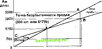 Порог рентабельности, ам. долл. = 700 ам. долл. : 0,4 = 1750 ам. долл. Соответственно, (1750 ам. долл. : 3,5) = 500 плакатов, либо Постоянные издержки 700 ам. долл. - -;г--= --= 500 плакатов. Валовая маржа 1,4 ам. долл. на единицу товара 2. Если арендная плата повысится до 1050 ам. долл. в неделю (т.е. на 50%), то Марии М. придется продавать уже по 750 плакатов в неделю, чтобы покрыть все расходы: 1050 ам. долл. : 1,4 ам. долл. = 750 плакатов и заработать на них 2625 ам. долл., прежде чем появится прибьшь: 1050 ам. долл. : 0,4 = 2625 ам. долл. Увеличение постоянных издержек на 50% подняло порог рентабельности также на 50%. Такое соответствие всегда присутствует при прочих равных условиях. При снижении постоянных издержек на ско.лько-то процентов, на столько же тфоцентов снизился бы и порог рентабельности. 3. При увеличении цены реализации с 3,5 ам. долл. до 3,85 ам. долл. валовая маржа на единицу товара составила бы (3,85 ам. долл. - 2,1 ам. долл.) = 1,75 ам. долл., коэффициент валовой маржи поднялся бы до (1,75 ам, долл. : 3,85 ам. долл.) = 0,4545. Тогда для достижения безубыточности пришлось бы продать (700 ам, долл, : ] ,75 ам, долл.) = 400 плакатов на сумму (700 ам, долл, : : 0,4545) - 1540 ам. долл, - это новый порог рентабельности. Повышение цены реализации снижает порог рентабельности, так как валовая маржа на единицу товара возрастает, 4. Если переменные издержки повысятся с 2,1 ам. долл. до 2,38 ам, долл., то валовая маржа на единицу товара составит (3,5 ам. долл. - 2,38 ам, долл.) = 1,12 ам. долл., а коэффициент валовой маржи снизится до (1,12 ам. долл, : 3,5 ам. долл.) = 0,32 Поэтому порог рентабельности повысится: (700 ам. долл. : 1,12) = = 625 плакатов и (700 ам. долл. : 0,32) = 2187,5 ам. долл. Естественно, при снижении закупочной цены Марии М. пришлось бы продать меньше, чем в исходном варианте, плакатов для достижения безубыточности. 5. Для получения заданной BejnwHHbi прибьши, например, 490 ам. до-ш. в неделю, сумма валовой маржи должна быть достаточной для покрытия постоятшк издержек и желаемой прибьши. Это означает, что необходимо будет продать (700 а.м, долл, + 490 ам. долл,): 1,4 ам, долл, = 850 плакатов на сумму (700 ам. долл. + 490 ам, долл.) : 0,4 = = 2975 ам. долл. Проверка: (3,5 ам, долл, х 850) = 2975 ам, долл. Итак, чтобы узнать количество продаваемого товара, приносящее заданную прибьшь, необходимо разделить сумму постояннььх затрат и желательной прибьши на валовую маржу, приходящуюся на единицу товара, а чтобы вычислить соответствующую величину выручки, нужно разделить су\агу постоянных издержек и желательной прибьши на коэффициент валовой маржи. 6. Определение сумм прибьши, соответствующих различным уровням выручки, очень удобно производить графическим способом (рис. 1 и 2). 6.1, Задаем произвольно объем продаж, скажем, в 1000 штук. Вычисляем выручку, соответствующую этому объему продаж (3,5 ам, долл, X 1000 = 3500 ам. долл.) и отмечаем соответствующую точку А на рис. 1. Соединяем точку А с началом координат. Полученный отрезок OA соответствует выручке от реализации. 6.2, Проводим линию постоянных издержек от точки С (уровень 700 ам. долл.) параллельно горизонтальной оси. ![]() Переменные издержки Постоянные издержки 500 1000 Количество единиц продукции, шт. Рис, 1 6.3.Вычисляем переменные издержки для заданного объема продаж: (2,1 ам, долл. х 1000) = 2100 ам. долл. Добавляем пере-.ченные издержки к постоянным и получаем суммарные издержки: (700 ам. долл, + 2100 ам. долл.) = 2800 ам. долл. Отмечаем точку В., соответствующую полным издержкам для объема продаж 3 1000 штук. 