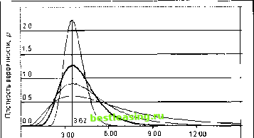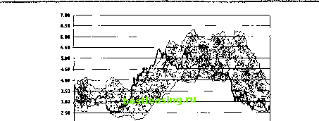 200% -100% 0% 30% 100% 200% Ожидаемая доходность инвестиций, Y (% годовых) Рис. 19.4. Плотность вероятности разброса значений доходности вложений в бумаги РАО ЕЭС через 20 торговых дней, квартал, полгода и год. Расчет волатильности произведен на основе дисперсии однодневных колебаний цены в первом квартале 2001 г. при средней ожидаемой доходности 0.3 (30%). Будущие значения стандартного отклонения пропорциональны корню квадратному из количества торговых дней. Толстая линия соответствует распределению вероятности через квартал и значению о = 0.31 Первый рисунок дает распределение плотности вероятности доходностей (в процентах годовых) инвестиций в бумаги РАО ЕЭС сроком на месяц, квартал, полгода и год. Видно, что по мере увеличения временного горизонта инвестиций увеличивается дисперсия, а кривые как бы расплываются . На больших сроках вероятности получить большие положительные и большие отрицательные доходности постепенно уравниваются. Вероятность получить более 100% годовых приблизительно равна вероятности получить отрицательную доходность ниже 50% (т.е. потерять средства). Второй рисунок представляет те же самые вероятности, но выраженные в будущих ценах акций: где Р(0) - текущее значение цены, равное на момент расчета 2.80 руб. за бумагу, а Г- предполагаемый срок инвестиций, выраженный в числе рабочих дней (соответственно 250 - число рабочих дней в году). ![]() Ожидаемая цена акций, Р (руб.) Рис. 19.5. Плотность вероятности разброса цен бумаг РАО ЕЭС через 20 торговых дней, квартал, полгода и год. Кривые на этом рисунке соответствуют распределениям вероятности доходности, приведенным на рис. 19.4. Среднее значение ожидаемой цены акции соответствует доходности 30% и равно 3.62. Расчет будущей волатильности произведен на основе дисперсии однодневных колебаний цены в первом квартале 2001 г. при цене актива 2.80 руб. за бумагу На первый взгляд, оценка плотности вероятности будущей доходности вполне разумна, если бы не то обстоятельство, что соответствующий разброс цен через год лежит в очень широких пределах. Сравните рис. 19.5 с рис. 19.4. Ожидаемые цены через год (самая пологая кривая) - от 1.5 до 7.5 руб. за бумагу - почти равновероятны. Прогноз на квартал (толстая кривая) сильно ограничивает наиболее вероятный разброс котировок. Однако и в этом случае цены часто выходят из коридора границ доверительных интервалов цен, рассчитываемых на основе границ коридора доходности (г- О , г + о). Дело в том, что реальная доходность на будущий период может существенно отличаться от сегодняшней и соответственно прогнозируемой средней величины <г>. На рис. 19.6 приведены результаты прогноза отклонений цены бумаг РАО ЕЭС на квартал вперед. Эти прогнозы соответствуют тому, что ожидаемая доходность будет находиться в интервале (т- о, т + о). За каждые 62* торговых дня в период с начала 2001 г. по середину сентября 2002 г. нами были вычислены дисперсия дневных колебаний D и соответствующая медиана доходности т. Медиана отлича- * Обычно количество рабочих дней в месяце принимается равным 21, в квартале - 62, в году - 250. ![]() 2.00 1.50 1.00 июл.01 сен.01 ноя 01 янв.02 мар.02 май.02 июл.02 сен.02 Рис. 19.6. Коридор прогнозируемых разбросов цены на квартал (62 торговых дня) вперед и реальные котировки РАО ЕЭС в период с 1 июля 2001 г по 13 сентября 2002 г Если сдвинуть расчетные границы вперед на 62 дня, то можно убедиться, что цена практически всегд