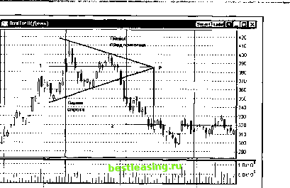 ствия временно отступают покупатели. Иногда, но существенно реже - продавцы. Такие отступления происходят чаще всего плавно, но временами процесс может принимать скачкообразную форму резкого изменения цен. Чем сильнее действующее сопротивление со стороны продавцов или покупателей, тем внушительнее происходит ценовое движение. В процессе такого движения стороны резко меняют соглашение о цене, и цена перескакивает на другую, существовавшую ранее или новую кривую спроса-предложения. Графически текущую временную динамику цен предложения и спроса, следуя ДеМарку, отображают линии предложения и линии спроса. Они проводятся через два последних по времени локальных дневных максимума цены и два последних минимума соответственно. Например, для построения линии предложения необходимо в масштабе дневных графиков найти такие два ближайших дня, в которые максимальная цена была выше максимальной цены предыдущего и последующего дней. Через эти точки проводится прямая линия. ДеМарк требует, чтобы при этом линия предложения была направлена вниз, а линия спроса - вверх. Нам это требование кажется чрезмерным, и мы его в анализе не применяем. Рассмотрим в качестве иллюстрации дневной график акций НК ЛУКОЙЛ, изображенный на рис. 20.1. Видно, как противоборствующие стороны сходились навстречу друг другу к некой цене, которую можно найти, продолжив линии до их пересечения. Точка Р на графике определяет уровень цены, который может оказаться устойчивым или неустойчивым. Она также соответствует времени наступления события, до которого силы противоборствующих сторон столкнутся и наступит развязка. Если ценовой рубеж Р неустойчив, то торговля перейдет в другое, более устойчивое состояние 2, где силы покупателей и продавцов вновь уравновесят друг друга. Если уровень устойчив, то торговля переходит в игровой диапазон в окрестности этого рубежа. При этом соответствующий треугольник вырождается, и напряжение уходит. Стороны удовлетворены. Спрос уравновесил предложение. На рис. 20.1 переход из одного состояния торговли, соответствующего уровню 1, в другое состояние 2, когда продавцы и покупатели пришли к новому соглашению о цене актива, произошел достаточно гладко. Но иногда это носит катастрофический характер, особенно неприятный для overnight-спекулянтов. В этом случае рынок ликвидных ценных бумаг теряет присущую ему устойчивость, и можно говорить о потере эластичности предложения. Существует общее правило, согласно которому, чем раньше цены покидают диапазон, ограниченный линиями спроса и предложения, ![]() мвй,01 июи.01 авг.01 Рис. 20.1. Сходящийся треугольник, образованный линиями спроса и предложения на дневном графике акций НК ЛУКОЙЛ. Пересечение линий в точке Р определяет цену, соответствующую неустойчивому уровню 1, а также значение времени, до которого должны произойти развязка и переход на более устойчивый уровень 2 тем более плавного, но и более мощного и значимого в абсолютных величинах рыночного движения можно ожидать. Чем дольше котировки находятся внутри треугольника спроса-предложения, тем устойчивее оказывается покидаемый уровень. Иными словами, чем ближе к точке Р котировки осуществляют прорыв и выходят за линию спроса или предложения, тем меньше в абсолютных значениях может быть рыночное движение. И, как уже отмечалось, в случае, если