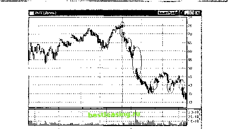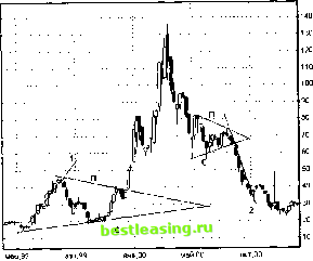 1999 2000 2001 Рис. 21.3. Недельный график движения котировок акций компании Intel Inc на конечном этапе одного из самых сильных в истории фондового рынка роста цен на акции отдельной компании На рисунке цифрами обозначены линии трендов Вблизи вершины видим сходящийся треугольник, образованный линиями спроса и предложения, пересекающимися в точке Р с 20 до 45 руб. за бумагу последовало снижение вплоть до начального уровня Затем осенью рост цен возобновился, и после небольшой борьбы линия предложения П была легко пройдена. Сопротивление было полностью снято, и котировки вышли на оперативный простор. Далее последовал беспрецедентный рост цены, продолжавшийся вплоть до апреля 2000 г без какого-либо противодействия со стороны продавцов Чаще всего устойчивые направленные движения котировок (тренды) сменяются дрейфом цены в горизонтальном направлении (с уклоном вниз, вверх или без такового) Торговля переходит в игровой диапазон с определенными границами, между которыми цена как бы заперта, те в так называемый боковик или рейндж Согласно вышеизложенному принципу, определенность ценовых рубежей приводит к полной неопределенности относительного будущего направления движения Вероятность продолжения предыдущей тенденции высока, но, к сожалению, никогда нельзя быть уверенным в том, что она будет продолжена с той же силой. Ниже на рис 213 приведен недельный график компании Intel Inc. на конечном этапе одного из самых сильных в истории фондового рынка роста цен на акции отдельной компании. Напомним, что за период с января 1988 г по март 2000 г. рыночная стоимость бумаг компании Intel Inc. выросла более чем в 180 раз Из графика видно, что после трендов (1) и (2) цены испытывают боковое движение с легким уклоном вниз. Такие движения в обратную сторону принято называть коррекционными Как правило, на растущем рынке после коррекционных движений рост возобновляется с новой силой. Именно так и произошло после коррекции, последовавшей за трендом (2) Новое восходящее движение проявилось с силой, превосходящей все предыдущие Обратите внимание на производную роста и наклон заключительной линии (3) восходящего движения в конце 1999 - начале 2000 г. Казалось тогда, что росту цен нет предела. Это общее свойство завершения трендов, к которому мы неоднократно будем возвращаться. К сожалению, это был последний аккорд Рубеж в 75 долл за бумагу оказался непреодолимым. На вершине в течение двух месяцев торговле сопутствовала очень высокая абсолютная волатильность Линии предложения и спроса образовали сходящийся в точке Р треугольник с биссектрисой угла, направленной вверх. Обычно треугольники пробиваются в ту сторону, куда направлена биссектриса. В нашем случае треугольник был пробит в противоположную сторону, т.е. вниз Началось сокрушительное падение с еще большей отрицательной производной вдоль линии тренда (4). Это падение сопровождалось серией разрывов и скачкообразных изменений цены. Нам такие разрывы цен встречались и раньше (см., например, рис. 13 1). Ниже, на дневных графиках, отражены существенные моменты движения цен вдоль тренда (4). Эти существенные моменты - серия разрывов цен, которые на рис 21.4 указаны эллипсами Первый разрыв был зафиксирован на максимуме рынка Это очень грозное предупреждение о возможном начале новой тенденции в направлении разрыва. За первым разрывом пос