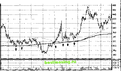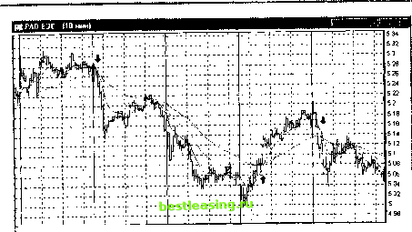 08 01 13 09 01 28 09 01 12 1 001 26 1 001 1211 01 2611 01 10 1 201 251201 110102 Рис. 25.2. Пример использования комбинации 10-, 25- и 50-дневных скользящих средних для открытия новых позиций на дневном графике котировок акций РАО ЕЭС России Как уже отмечалось, чем меньше период осреднения п, тем ближе и лучше скользящая средняя описывает действующие цены. Чем больше и, тем мы имеем более сглаженную кривую, которая лучше описывает тенденцию. На рис. 25.2 линия, соответствующая 10-дневной скользящей средней, наиболее близко расположена к ценовым барам, и наоборот, более гладкая 50-дневная линия в среднем отстоит далее всего от действующих цен. Промежуточное положение занимает линия, описывающая 25-дневную скользящую среднюю. Это правило справедливо для трендовых состояний акции. При отсутствии тренда различные скользящие средние часто путаются и пересекаются как между собой, так и с действующими ценами. Таким образом, представленный график иллюстрирует общую закономерность, которой часто пользуются для определения потенциальных рубежей разворота цен и уровней поддержки/сопротивления. При приближении к 200-дневной скользящей средней цены с большой вероятностью развернутся и двинутся в обратном направлении. И в этом смысле данная линия является линией поддержки или сопротивления. Формулировка с большой вероятностью означает, что число пробоев этой линии в несколько раз меньше, чем число разворотов вблизи нее. Тем не менее пробои тоже случаются. Каждое такое событие - это сигнал смены тренда. Причем именно сигнал, который еще должен быть подтвержден дальнейшим развитием событий. Рассмотрим, в частности, пробой вверх, обозначенный третьей стрелкой в районе 26 октября. Уровень 200-дневной средней был пробит наверх лишь с третьей попытки. Спустя два дня точно так же успешно был пробит и уровень 100-дневной скользящей средней. Эта комбинация двух последовательных пробоев дает сигнал зарождения долгосрочного и среднесрочного трендов наверх и соответственно является очень сильным сигналом на покупку. Дальнейшее развитие событий подтвердило этот сигнал. В течение еще трех месяцев цена трижды безуспешно пыталась вернуться вниз и вновь преодолеть уровень 200-дневной средней, пока наконец не оторвалась от него и не ушла наверх. Правило пробоя 200-дневной средней, приведенное выше и формирующее сигнал на покупку (при пробое снизу) или на продажу (при пробое сверху), справедливо для скользящих средних с близкой к нулю производной, иными словами, оно действует для достаточно пологих линий скользящих средних. У этого правила есть исключения. Суть исключения состоит в том, что направление тренда определяется не только расположением цен относительно скользящей средней, но и направлением самой скользящей средней. Если скользящая средняя растет (что также служит подтверждением восходящего тренда), то прорыв ценами этой линии вниз с большой вероятностью может быть ложным, а следовательно, должен рассматриваться как сигнал к покупке. Наоборот, если 200-дневная скользящая падает (что косвенно свидетельствует о продолжении даун-тренда), то прорыв этой линии ценами вверх может интерпретироваться как хорошая точка входа для открытия коротких позиций, т.е. как сигнал к продаже. Как только акция начинает входить в тренд (напомним, что цены в течение приблизительно двух третей жизни находятся 