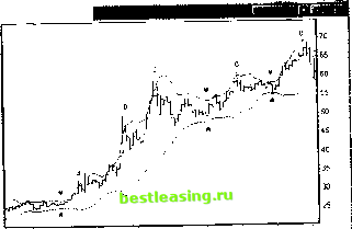 границы которых строятся на фиксированном в процентах расстоянии от базовой линии скользящей средней, границы Боллиндже-ра строятся на расстоянии среднеквадратического отклонения цены от скользящей средней МА(п) Вновь, как и при построении скользящих средних, параметрами являются период осреднения п и значение цен С = {CLOSE, HIGH, LOW, OPEN}, по которым строятся скользящее среднее и соответственно границы Боллинджера: LowerBand(n, d) = МА(п)- d\j Е(С - MAf, V гж1 (28.1) UpperBand(n, d) = MA(n) + d\ji(C~MAf. Кроме того, в качестве параметра используется величина d- коэффициент смещения, указывающий, на сколько стандартных отклонений необходимо сдвинуть верхнюю и нижнюю границы. Расстояние W между границами Боллинджера целиком зависит от стандартного отклонения цены от своих средних значений: W=2d\jli(C-MAf. (28.2) Соответственно границы Боллинджера сужаются, когда цены становятся более постоянными (менее волатильными), и расширяются, когда цены становятся более изменчивыми. Коэффициент смещения d определяет границы доверительного интервала. При d = 1 цены будут находиться внутри границ Боллинджера 68.3% своего времени за следующие п торговых периодов. При d= 2 границы расширяются, и цены в течение следующих п торговых периодов будут находиться внутри интервала уже с вероятностью 95.4%. Это означает, что в течение ближайших п баров вероятность цен покинуть границы Боллинджера с d - 2 составляет только 4.6%. Границы далеко раздвигаются, если d > 2. По этой причине использование d > 2 лишено всякого смысла. На рис. 28.1 приведен типичный вид границ Боллинджера для часового графика котировок обыкновенных акций АК Сбербанк РФ. Видно, что цены в основном находятся внутри области, ограниченной верхней и нижней границами конверта. Одним из способов использования границ Боллинджера является поиск мест, где границы существенно сужаются. Считается, что после таких сужений цены способны совершить сильное движение. На рис. 28.1 стрелками указаны сужения границ Боллинджера, за которыми следует значительный рост. К сожалению, использование сужений границ Боллинджера не дает ответа на вопрос, в какую сторону будет направлено движение цены. Для определения возможного направления цены необходимо привлекать другие индикаторы. И Сбербанк (Час) 5 300 5 200 5 100 5 000 4 900 4 800 4 700 4 600 4 500 4 400 4 300 4 200 4 100 4 000 3 900 3 800 3 700 3 600 103ПН 2703СР 29 03ПТ 0204Вт 04 044т 0804ПИ 1004 Рис. 28.1. Границы Боллинджера для часовых графиков котировок акций АК Сбербанк РФ (п = 10, С= CLOSE, d=2) На рис. 28.2 показано использование границ Боллинджера для дневных графиков акций ОАО НК Сибнефть Ш СмбнеФт о(Лет ![]() ! 24 01 02 0Г02 02 21 02 02 11 0302 25 03 02 08 04 02 2204 02 0805 02 23 05 02 Рис. 28.2. Границы Боллинджера для дневных графиков бумаг ОАО НК Сибнефть (п= 10, С= CLOSE, d=2) И здесь стрелки указывают сужение границ Боллинджера. Еще одно использование границ Боллинджера состоит в поиске моментов выхода цены на какую-либо границу. При этом трейдеры ищут сигналы двух типов касания либо пересечения цен с верхней или нижней границей. Трактовка этих сигналов различна для моментов касания и моментов пересечения. Считается, что после соприкосновения графика цены с границей Боллинджера следует откат и возвращение внутрь полосы Такие точки показаны на рис. 28.2 буквами due. И наоборот, если график цены выходит за пределы границ Боллинджера, то следует ожидать продолжения тенденции. Такие точки указаны на рис. 28.2 буквами а, 