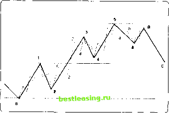 4. Каждая рыночная волна развивается во времени по своим законам. Момент ее завершения, равно как и ее величина, могут быть с высокой точностью предсказаны, если правильно определены все рыночные волны, имеющие больший временной масштаб, и точно определено текущее состояние рынка. 5. Если предсказанный момент завершения волны или ее величина не соответствуют ранее определенным величинам, то, значит, исходный анализ волн Эллиотта был проведен неверно. Именно четвертая аксиома теории Эллиотта и содержит то рациональное зерно, которое пытаются найти ее приверженцы. А способ поиска этого философского камня предоставляет набор правил для идентификации волн разных масштабов и интерпретации текущего состояния рынка. Таким образом, теоретически оказывается возможным определить будущие целевые уровни и точки разворота рынка на любом масштабе времени. В этой связи волновую теорию Эллиотта называют еще проактивной теорией, которая предсказывает (а не подтверждает в отличие от подавляющего большинства технических индикаторов) будущее движение рынка. Рассмотрим изложенные принципы более подробно. На рис. 31.1 схематично изображена полная фаза развития бычьего рынка по Эллиотту. ![]() Рис. 31.1. Развитие бычьего тренда по теории Эллиотта. Завершение первых пяти волн обозначено цифрами, завершение каждой волны трехволновой понижательной коррекции обозначено литерами Основное движение восходящего рынка формируется пятью волнами, обозначаемыми последовательно цифрами от 1 до 5. Эти пять волн прорисованы на рис. 31.1 толстыми линиями. Точка 0 - это минимальное значение цен, с которого началось рыночное движение. Цифры от 1 до 5 обозначают вершины волн, т.е. соответственно локальные максимумы и минимумы цены в выбранном масштабе времени. Первая, третья и пятая волны основного движения называются импульсными. Они всегда развиваются вдоль основной тенденции. Вторая и четвертая волны называются корректирующими. Они развиваются против основной тенденции. Венчают все это восходящее движение рынка три волны возвратного движения. Эти волны обозначают буквами А, Ви С. Рассмотрим схематично развитие медвежьего рынка по Эллиотту, изображенное на рис. 31.2.